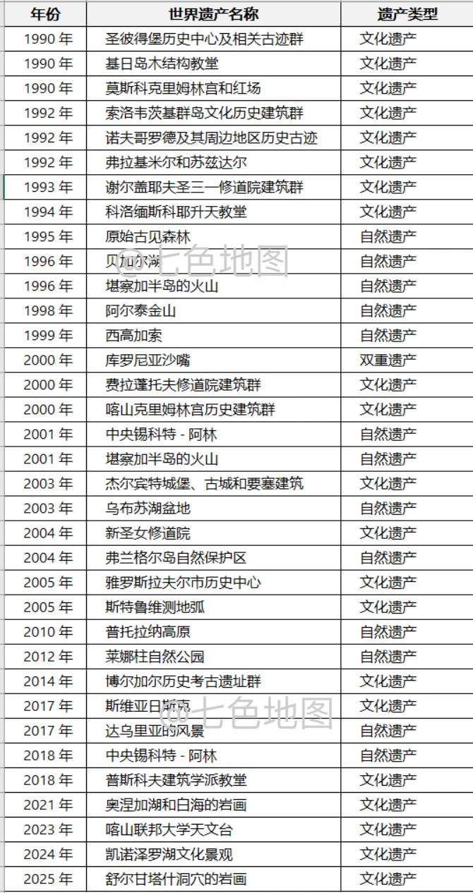 俄罗斯免签,终于有眉目了, 从星罗棋布的东正教教堂, 到一座座历史悠久的古城, 从贝加尔湖到堪察加火山, 这个世界上面积最大的国家, 可以探索的地方,实在太多了。 我之前去过五次俄罗斯, 感觉只是探访了一小部分而已。 我是,环球旅行第18年, 足迹123国,800多处世界遗产。 汇集俄罗斯全境人文和自然精华, 截至2025年,俄罗斯共有33处世界遗产, 其中21处为文化遗产,11处为自然遗产。 跨国遗产:库罗尼亚沙嘴与立陶宛共享, 达乌里亚景观和乌布苏湖盆地与蒙古共享, 斯特鲁维测地弧与九个欧洲国家共享。 整理了一份俄罗斯全部33处世界遗产列表, 请见图2。 我的俄罗斯世界遗产打卡进度:15/33 基本上都在欧洲部分, 我准备明年好好探索亚洲部分。 这个面积过于巨大、 遗产分布过于分散的国度, 就是要考验你的耐心、决心和恒心。 我的对策是:平常心。 篇幅有限,本文概况攻略,图片顺序排列 详细图文,可参考之前的俄罗斯旅行笔记。 📍克里姆林宫和红场 美丽度 ⭐️⭐️⭐️⭐️⭐️便利度 ⭐️⭐️⭐️⭐️⭐️ 📍圣彼得堡 美丽度 ⭐⭐️️⭐️⭐️⭐️便利度 ⭐️⭐️⭐️⭐️⭐️ 📍基日岛 美丽度 ⭐⭐️️⭐️⭐️⭐️便利度 ⭐️⭐️⭐️ 📍费拉蓬托夫修道院 美丽度 ⭐️⭐️⭐️便利度 ⭐️⭐️⭐️ 📍喀山克里姆林宫 美丽度 ⭐️⭐️⭐️⭐️便利度 ⭐️⭐️⭐️⭐️ 📍科洛缅斯科耶升天教堂 美丽度 ⭐️⭐️⭐️便利度 ⭐️⭐️⭐️⭐️⭐️ 📍诺夫哥罗德 美丽度 ⭐️⭐️⭐️⭐️便利度 ⭐️⭐️⭐️⭐️ 📍索洛韦茨基群岛 美丽度 ⭐️⭐️⭐️便利度 ⭐️⭐️ 📍谢尔盖耶夫圣三一修道院 美丽度 ⭐️⭐️⭐️⭐️便利度 ⭐️⭐️⭐️⭐️ 📍弗拉基米尔和苏兹达尔 美丽度 ⭐⭐️️⭐️⭐️⭐️便利度 ⭐️⭐️⭐️⭐️ 📍新圣女修道院 美丽度 ⭐️⭐️⭐️⭐️便利度 ⭐️⭐️⭐️⭐️⭐️ 📍雅罗斯拉夫尔 美丽度 ⭐️⭐️⭐️便利度 ⭐️⭐️⭐️⭐️ 📍博尔加 美丽度 ⭐️⭐️⭐️⭐️便利度 ⭐️⭐️⭐️ 📍斯维亚日斯克 美丽度 ⭐️⭐️⭐️便利度 ⭐️⭐️⭐️ 📍普斯科夫建筑学派的教堂 美丽度 ⭐️⭐️⭐️便利度 ⭐️⭐️⭐️