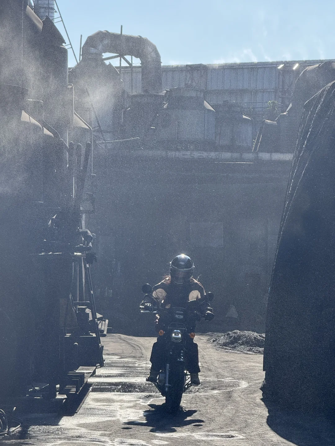 路过永涛色母工厂时,黑色厂房喷洒的水珠在阳光下闪烁,像走进了电影场景