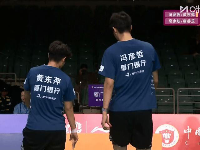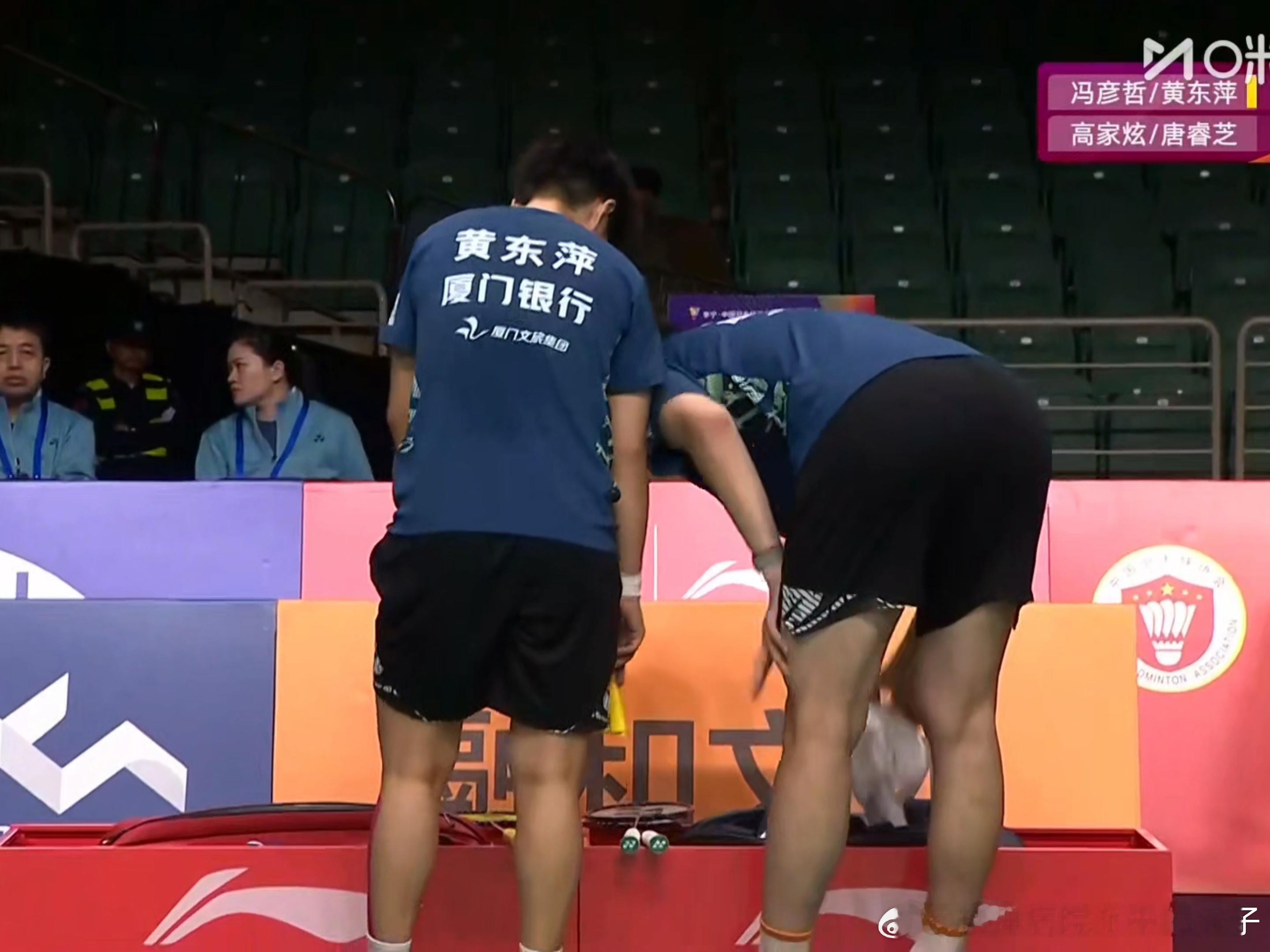 冯彦哲:准备捡球发球(忽然发现到8分局间了)羽毛局间间歇的毛巾桶太低了小冯蹲下去都到东萍胸口了(不是