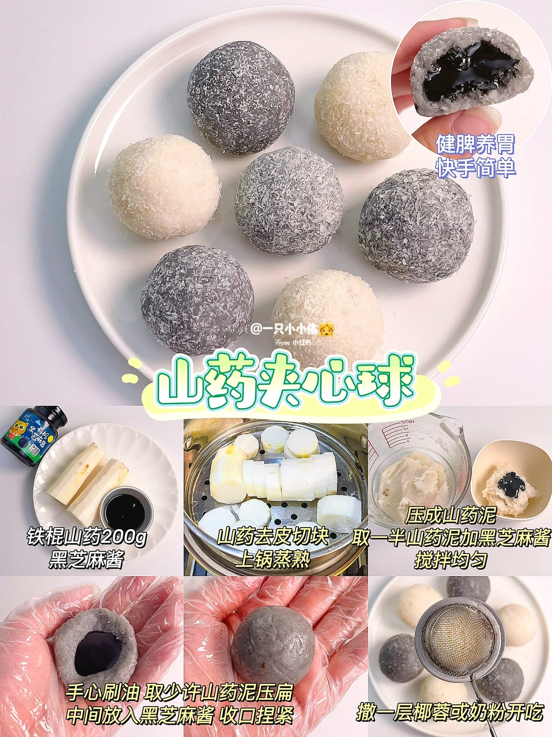 🔸步骤:山药去皮切块上锅蒸熟,压成山药泥,取一半山药泥加黑芝麻酱搅拌均匀;手心刷油,取少许山药泥压扁,中间放入黑芝麻酱收口捏紧,撒一层椰蓉或奶粉开吃