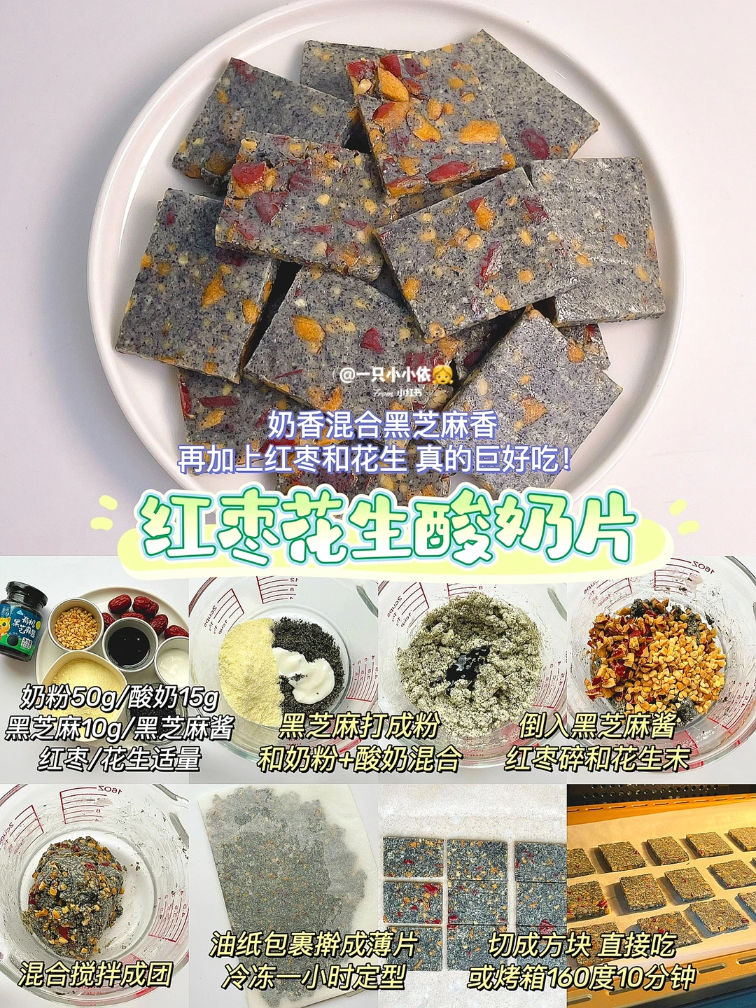 🔸步骤:黑芝麻打成粉,和奶粉+酸奶混合,倒入黑芝麻酱、红枣碎和花生末,混合搅拌成团,油纸包裹擀成薄片,冷冻一小时定型,切成方块,直接吃或烤箱160度10分钟