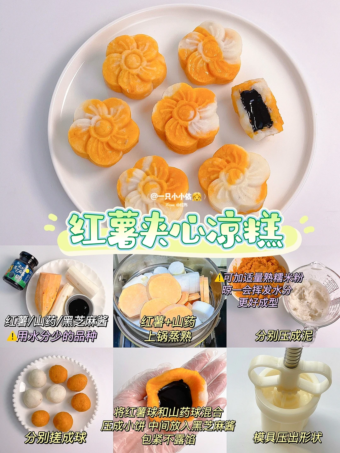 🔸步骤:红薯+山药上锅蒸熟,分别压成泥、搓成球,将红薯球和山药球混合压成小饼,中间放入黑芝麻酱,包紧不露馅,模具压出形状