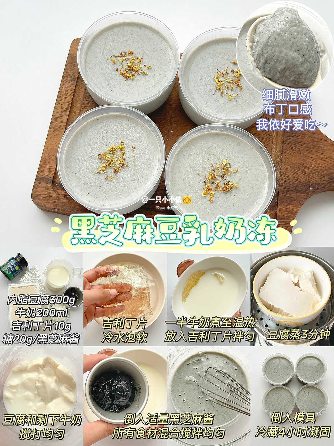 🔸步骤:吉利丁片冷水泡软,一半牛奶煮至温热,放入吉利丁片拌匀;豆腐蒸3分钟,和剩下牛奶搅打均匀;倒入适量黑芝麻酱,所有食材混合搅拌均匀,倒入模具冷藏4小时凝固