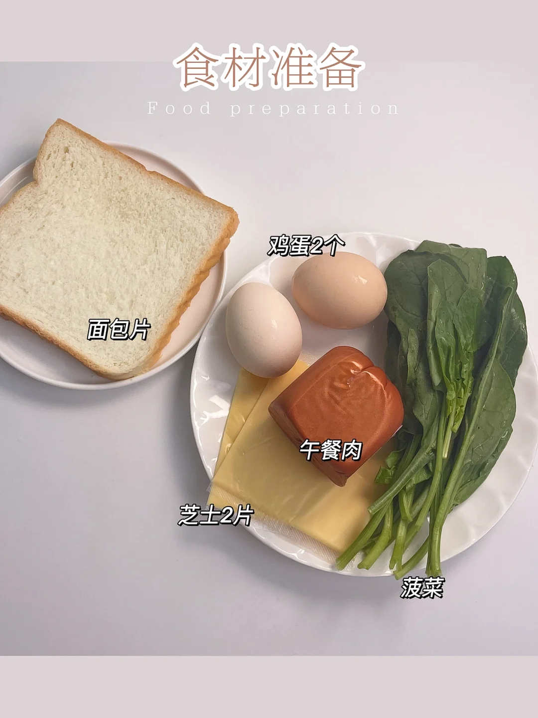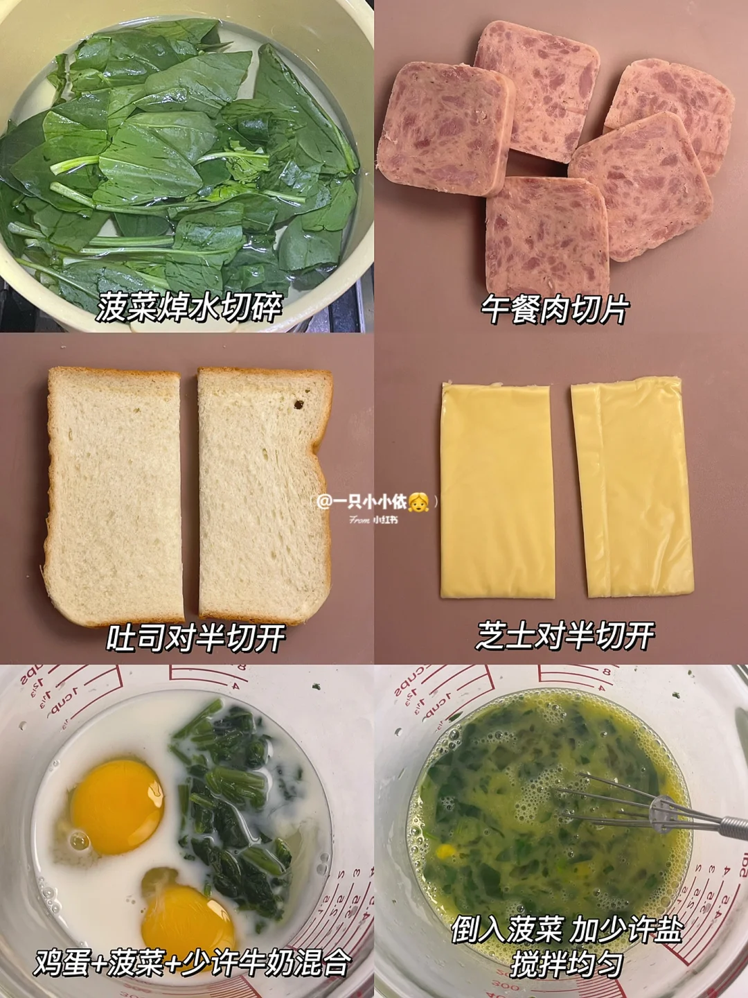 1⃣️菠菜焯水切碎,午餐肉切片煎熟备用,吐司和芝士对半切开;