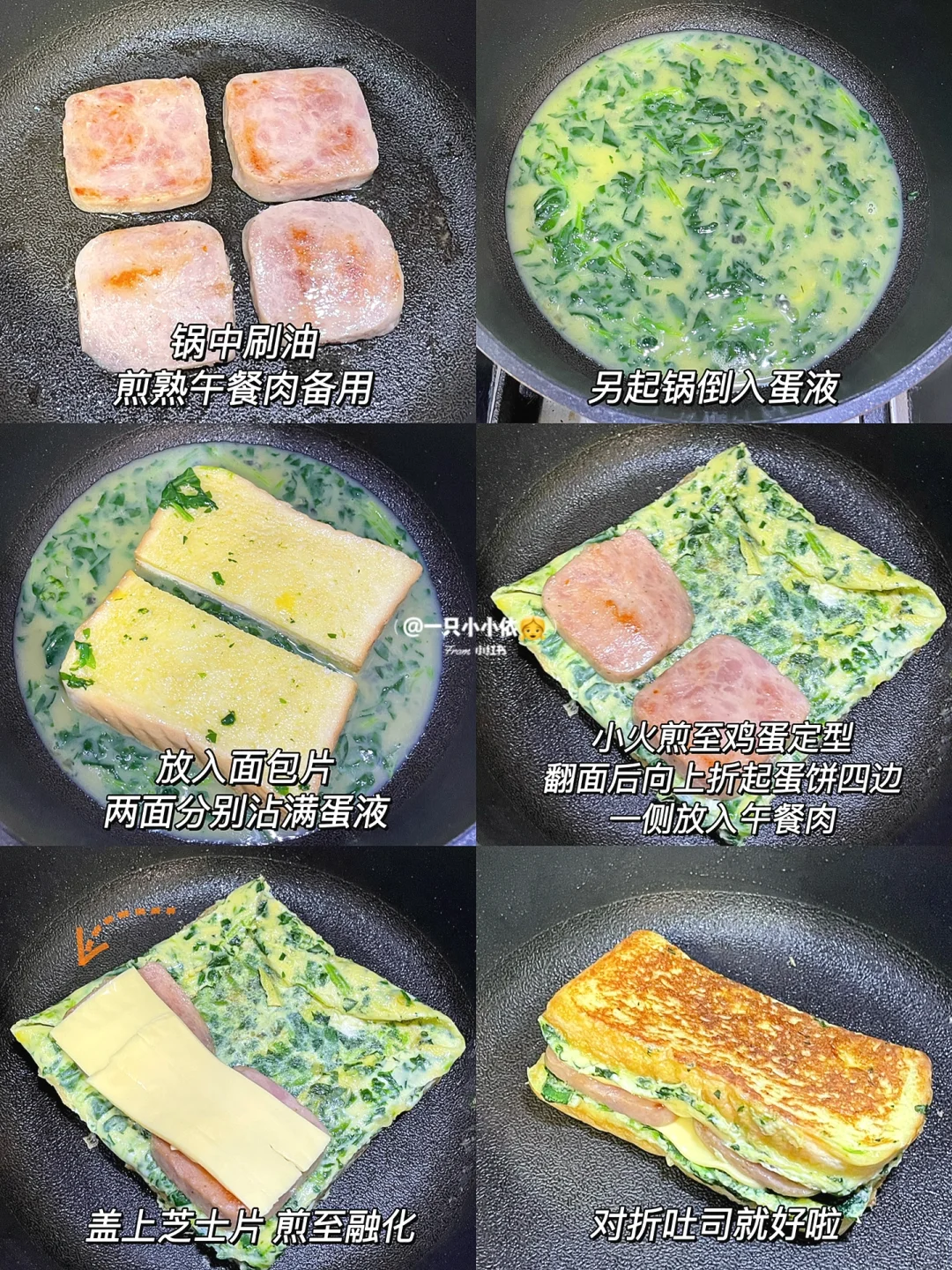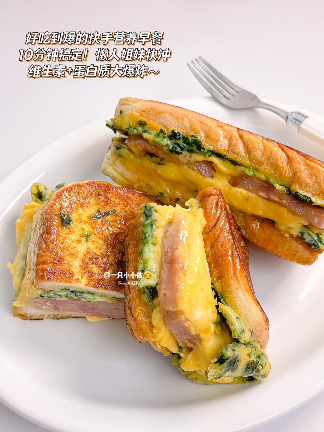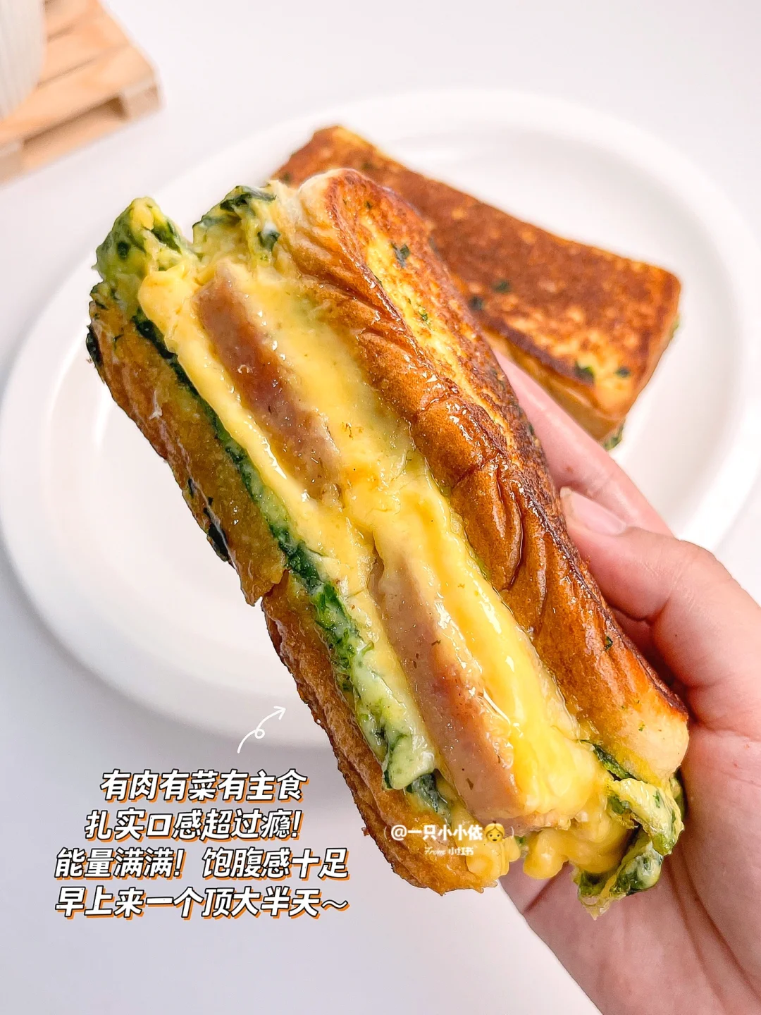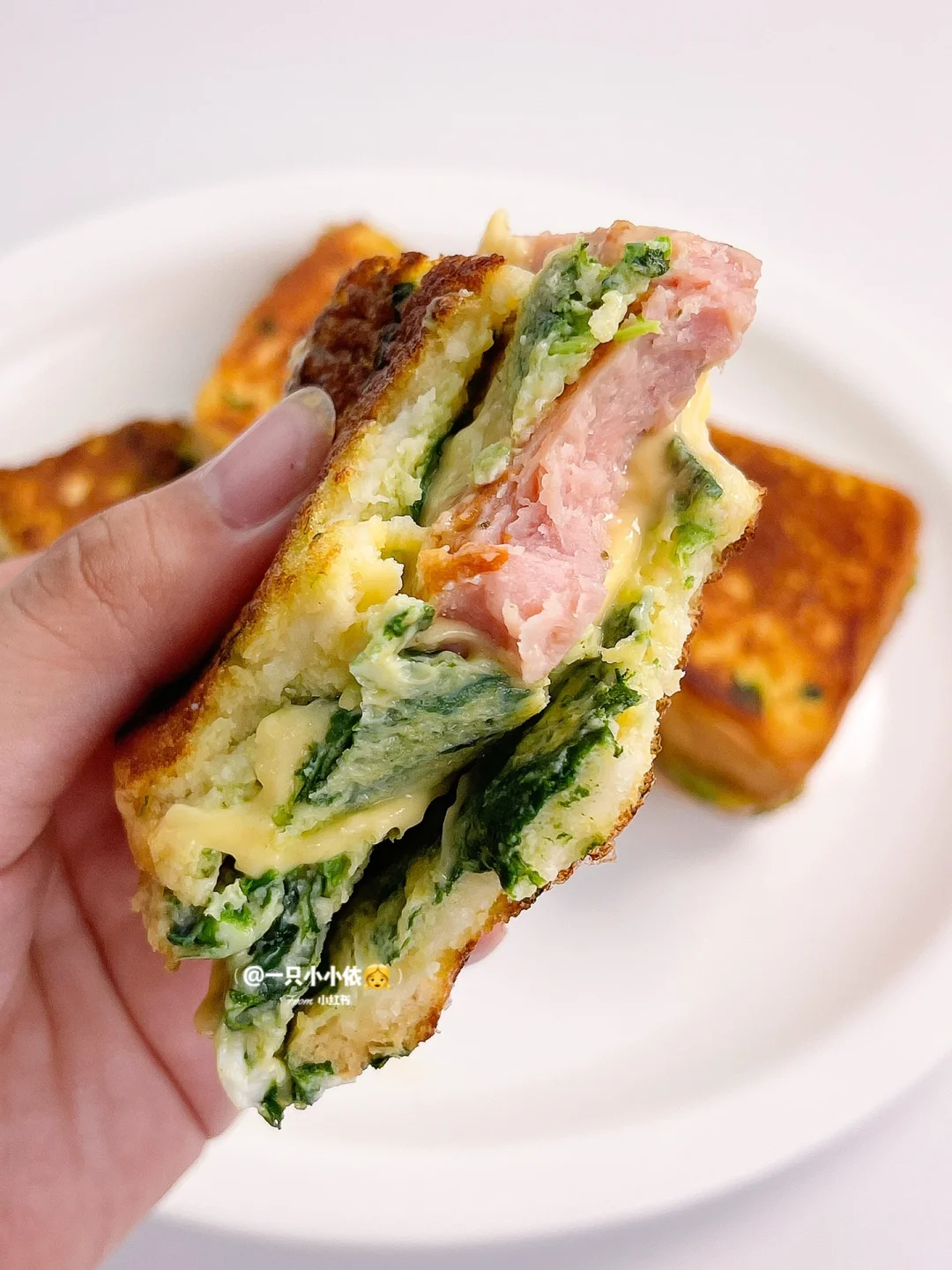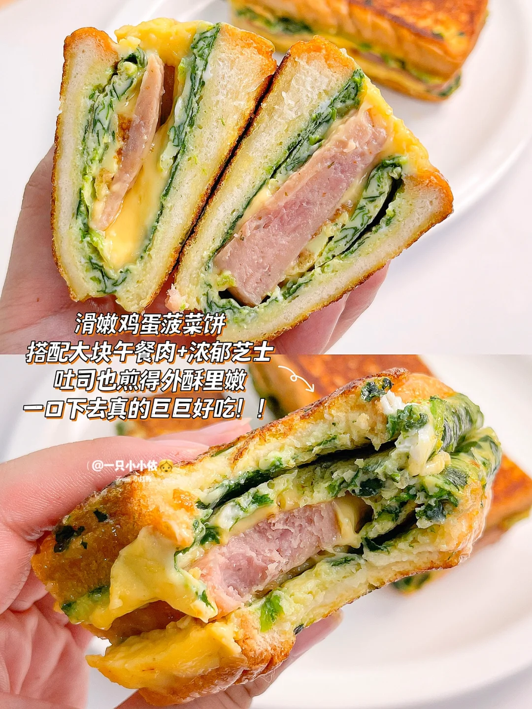 ✨10分钟快手早餐,会爆浆的芝士蛋包三明治~软嫩菠菜蛋饼+肉感chao足的午餐肉+浓郁芝士,再搭配外酥里软的吐司,一口下去巨满足🥰有肉有菜有主食,维生素和蛋白质大爆炸!做起来也超简单哦~早起10分钟就搞定👏🏻