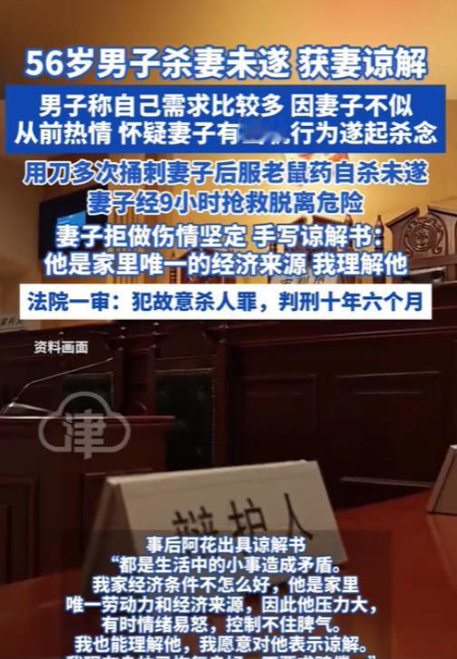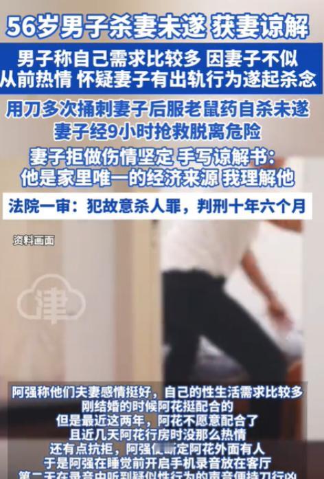 吉林,一56岁男子平均每天都要和妻子行房,可妻子却没了兴致,男子怀疑妻子出轨,于是持刀捅了妻子几刀,随后服老鼠药自杀,但未能成功。 这样的家庭悲剧听着就让人心里发堵。 受伤的妻子被邻居救下后,第一反应不是追究丈夫责任,反而埋怨人家多管闲事,说他是家里的顶梁柱不能坐牢,这操作真是让人看不懂。 本来想不通为什么受害者会替施暴者说话,后来发现这背后藏着太多无奈。 这对夫妻结婚多年,感情早就被柴米油盐磨得没了当初的温度。 丈夫赵某每天都要过夫妻生活,妻子李某却因为身体和心里的双重疲惫越来越抗拒,这种需求上的差异慢慢变成了矛盾的导火索。 赵某觉得妻子变心了,开始偷偷观察跟踪,可一直没找到实质性的证据,焦虑感像野草一样疯长。 那天晚上赵某在客厅放了手机录音,第二天听到里面有奇怪的动静,他立马认定妻子出轨了。 其实后来才知道,那些声音可能只是家具挪动或者宠物弄出来的声响,但当时他已经被嫉妒冲昏了头。 拿着刀冲到卧室质问妻子,两个人越吵越凶,情绪一上来就动了手,李某满身是血跑出去求救,赵某看着自己做的事,一时想不开就喝了老鼠药,好在最后被及时发现救了回来。 李某被送到医院后,醒来第一句话就是问丈夫怎么样了,还跟警察说不想追究。 邻居都觉得她傻,可她有自己的苦衷。 家里的开销全靠赵某打工维持,孩子上学、老人看病都指着他,一旦赵某坐牢,这个家就彻底垮了。 这种经济上的依赖让她不得不选择妥协,毕竟生活不是光靠感情就能过下去的。 法院最后判了赵某十年六个月,比同类案件轻了不少。 法官考虑到这是家庭矛盾引发的,赵某当时情绪激动,加上李某也出具了谅解书。 不过就算这样,十年多的刑期也够他受的了。 想起之前上海有个类似的案子,丈夫因为感情问题砍伤妻子,没有得到谅解,直接判了十二年,这么一看,被害人的态度对判决结果影响还挺大的。 现在很多夫妻都面临类似的问题,结婚时间长了,感情淡了,沟通也少了。 赵某要是能早点和妻子好好谈谈,或者找个心理医生疏导一下,可能就不会走到这一步。 李某要是经济独立点,也不用在被伤害后还得替对方说话。 说到底,婚姻里不光要有爱,还得有平等和尊重,少点猜忌,多点沟通,才能避免悲剧发生。 如此看来,这起案件不光是夫妻两个人的事,也反映出一些社会问题。 很多中年女性因为长期当家庭主妇,失去了经济来源,只能依附丈夫生活。 相关部门是不是该多提供些婚姻咨询服务,或者给这些女性提供就业培训,让她们有底气掌握自己的人生。 毕竟,靠牺牲尊严换来的家庭完整,根本不是真正的幸福。 这件事也给所有夫妻提了个醒,过日子难免有矛盾,遇到问题别憋着,也别用极端方式解决。 有话好好说,有事慢慢商量,实在不行就寻求帮助,千万别让小事变成大事,最后追悔莫及。 家庭应该是温暖的港湾,而不是充满猜忌和暴力的战场,希望每个人都能在婚姻里找到平衡,既守护家庭,也保护好自己。
