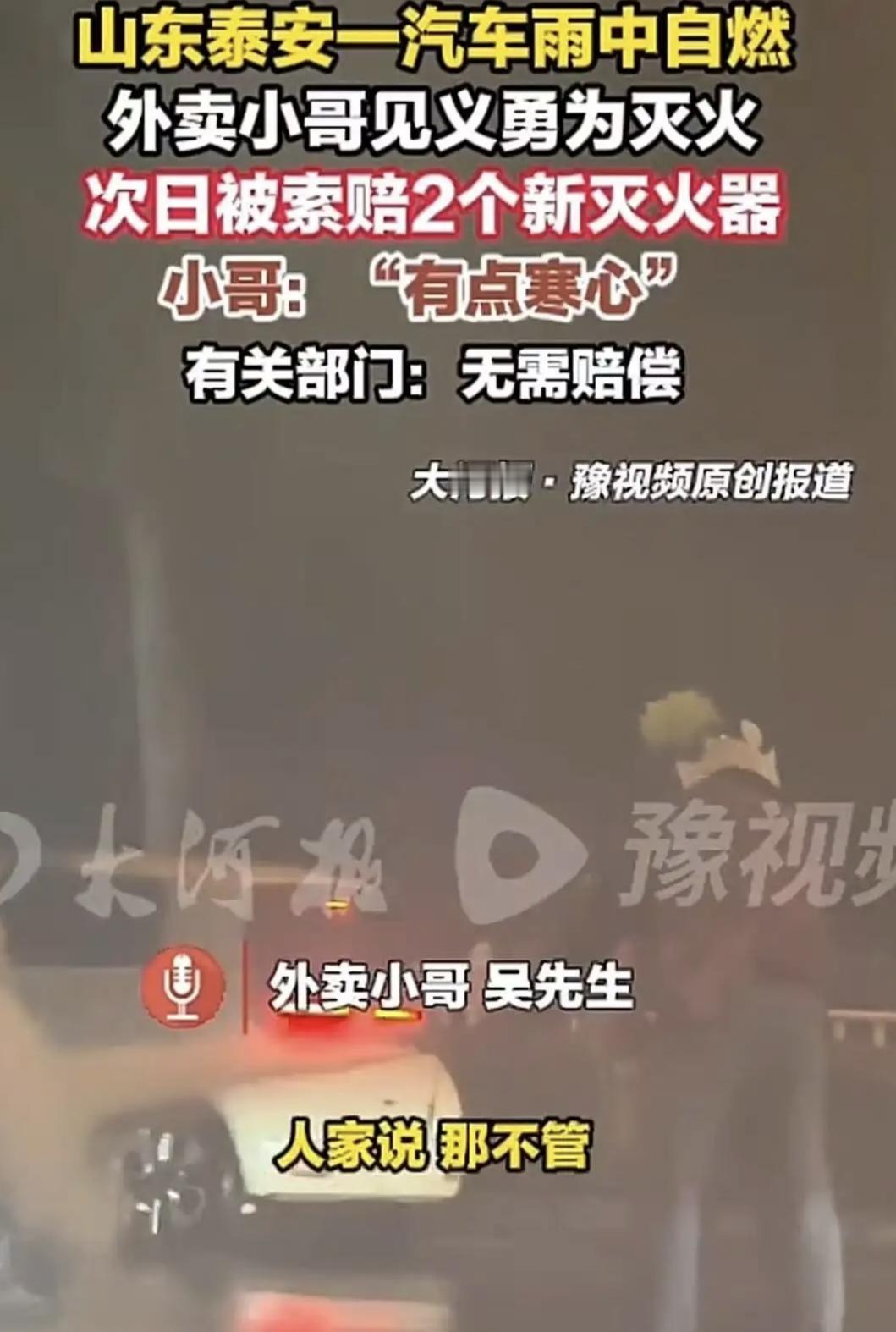 山东泰安,一辆车突发自燃,现场惊心动魄,就在大家还在焦急观望的时候,一名外卖小哥挺身而出,从附近警务室借来灭火器,奋力扑灭火焰,守护了公共安全。英雄本色,岂容忽视! 可是,戏剧性的一幕却发生了——第二天,这位外卖小哥竟然被通知,要赔偿两个新的灭火器!这一消息顿时让人气炸,不少网友纷纷表达了自己的不满:“这不是调侃吗?外卖小哥灭火为大家冲在前线,结果反倒被罚‘救火费’?这公平吗?”“赔偿灭火器?起火车主是不是更应该赔?毕竟车主是火灾的源头,外卖小哥只是施救者,难道施救者还成了‘倒霉蛋’?” 说到底,这起事件表面看似一场简单的赔偿纠纷,却深刻反映出社会中对英雄行为的认可与保护缺失。真正需要反思的是,当一个普通人挺身而出保护公共安全,社会是否有足够的支持和制度保障,避免他们变成“待宰羔羊”?更重要的是,我们是不是忘了,火灾的起因源于那辆自燃的汽车,责任理应由起火车主承担,而不是施以援手的好心人! 这也提醒我们,文明的社会不仅需要守法,更需要守心。当正义与善意转化为无端的赔偿负担,谁还敢做那个“第一反应者”?如果救火的人最后得背上赔偿的“包袱”,谁还能保证遇见危险时,大家都敢站出来? 全国上下都在呼唤安全与和谐,但这安全的守护,绝不应是少数人的“单打独斗”。社会应建立完善的机制,让每一个像这位外卖小哥一样的普通英雄,得到应有的保护和尊重,而不是背负莫名其妙的赔偿。 朋友们,你怎么看?你是否也为这位勇敢灭火却被追讨赔偿的外卖小哥感到寒心?法律的天平,应当更倾向正义,而非冷酷的数字账本。评论区等你的声音,一起为善良和正义发声,给这位“平凡英雄”撑起不倒的保护伞!,自燃新能源汽车 车辆电池自燃 私家车自燃路遇自燃车