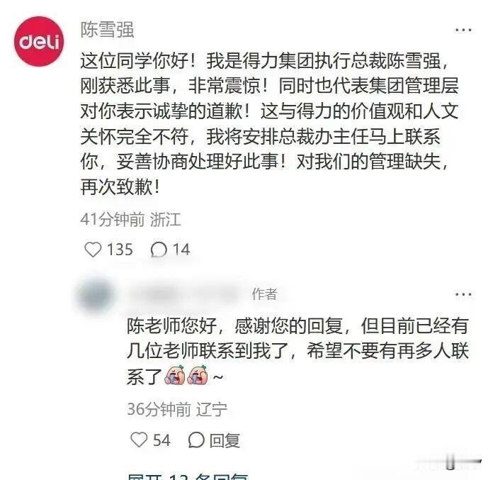 得力员工因跛脚遭拒入职.CEO致歉后劳动部门介入调查。 9月29号有位网友发帖说,自己五月初通过得力集团三轮面试,岗位是HRBP。到宁波宁海总部入职当天,人事问他腿是怎么回事,他说明了小时候得过病但不影响工作。结果下午就被通知领导不同意入职,还让他发微信说主动离职。这位网友有七年工作经历,还升过职,现在怀疑是腿的问题被辞退。 得力CEO陈雪强在帖子下道歉,说这事不符合公司价值观,让高管联系处理。公司客服证实这是陈雪强本人留言,正在核实情况。宁海劳动监察大队说企业自己在处理,他们等结果。目前事情还在调查中,后续怎么处理还不清楚。