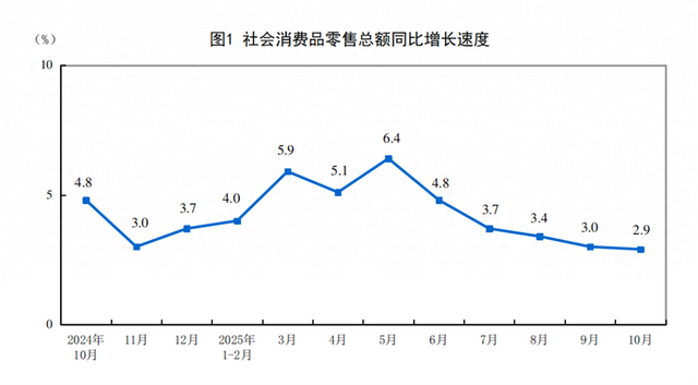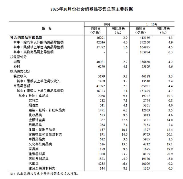 10月份,社会消费品零售总额46291亿元,同比增长2.9%。其中,除汽车以外的消费品零售额42036亿元,增长4.0%。1—10月份,社会消费品零售总额412169亿元,增长4.3%。其中,除汽车以外的消费品零售额372160亿元,增长4.9%。
