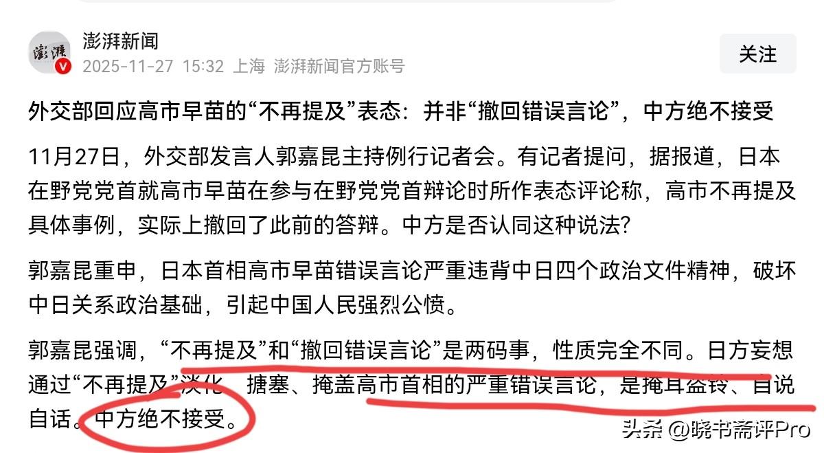 高市早苗要是识趣,就应该公开表示支持一个中国原则,日本不会介入中国的内政!现在倒好,跟我们打马虎眼,以为可以骗过我们,没想到我们外交部发言人再次直接挑明称,“不再提及”与“撤回错误言论”是两回事,中国绝不接受。很显然,我们这样的表态这等于是接着对高市早苗进行外交反击。 其实现在高市早苗已经软下来了,有一点想要找台阶下的意思。对于我们的反制,高市早苗压住国内的极端言论,不敢动我们的外交官,而对于我们的经济施压,日本也只能承受。现在表示不再提及,意思是以后不会再犯此类错误。但,高市早苗还是低估了事态的严重性。我们做了那么多的动作,高市早苗才软了一点点,这明显是诚意不足。 如果高市早苗没有那种军国主义扩张的心思,现在她应该洗心革面,进行切割。但是高市早苗明显没有这个魄力。高市早苗害怕成为日本右翼的“罪人”,害怕出现连锁反应,被内部逼宫下台,所以遮遮掩掩。但从我们的角度而言,高市早苗用行为再次验证其本人就是极右翼分子。高市早苗的心里面肯定是不愿意悔改的,但是重压之下,我们倒要看高市早苗能硬撑多久。