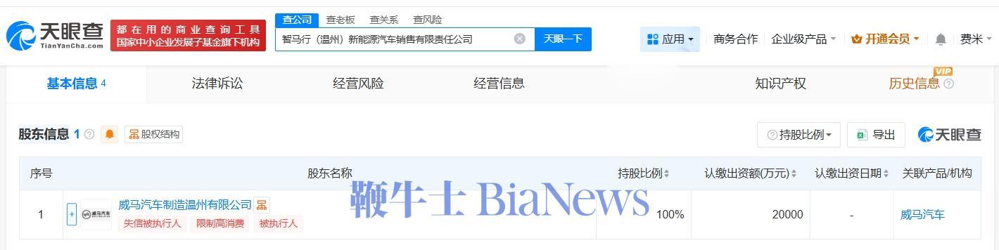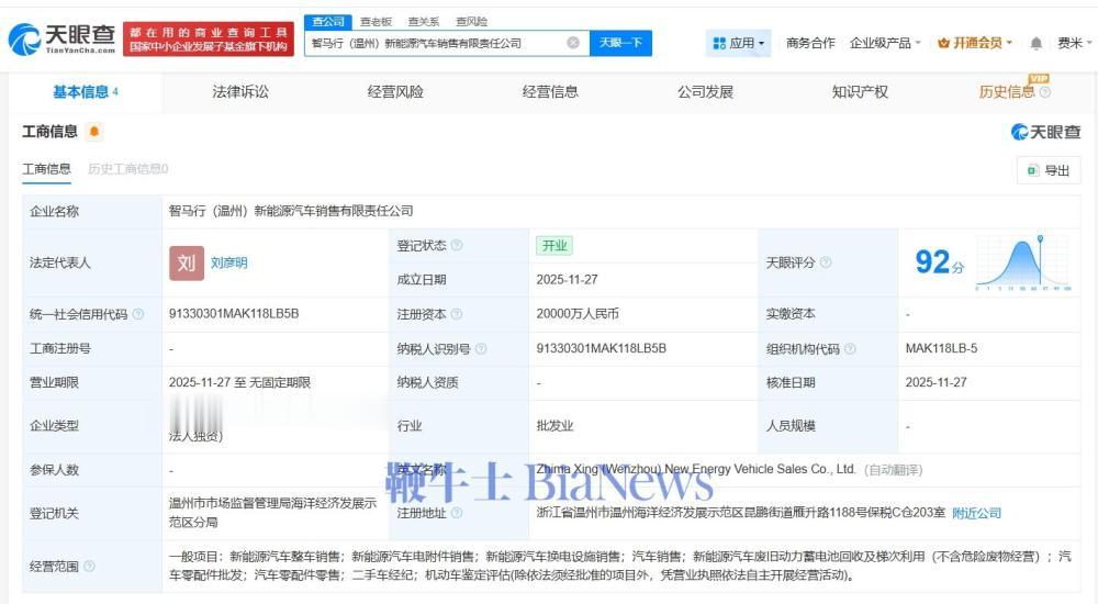 电车界11月27日消息,据天眼查App显示,11月27日,智马行(温州)新能源汽车销售有限责任公司成立,法定代表人为刘彦明,注册资本2亿人民币,经营范围包括新能源汽车整车销售、新能源汽车电附件销售、新能源汽车换电设施销售、汽车销售等。股东信息显示,该公司由威马汽车制造温州有限公司全资持股。
