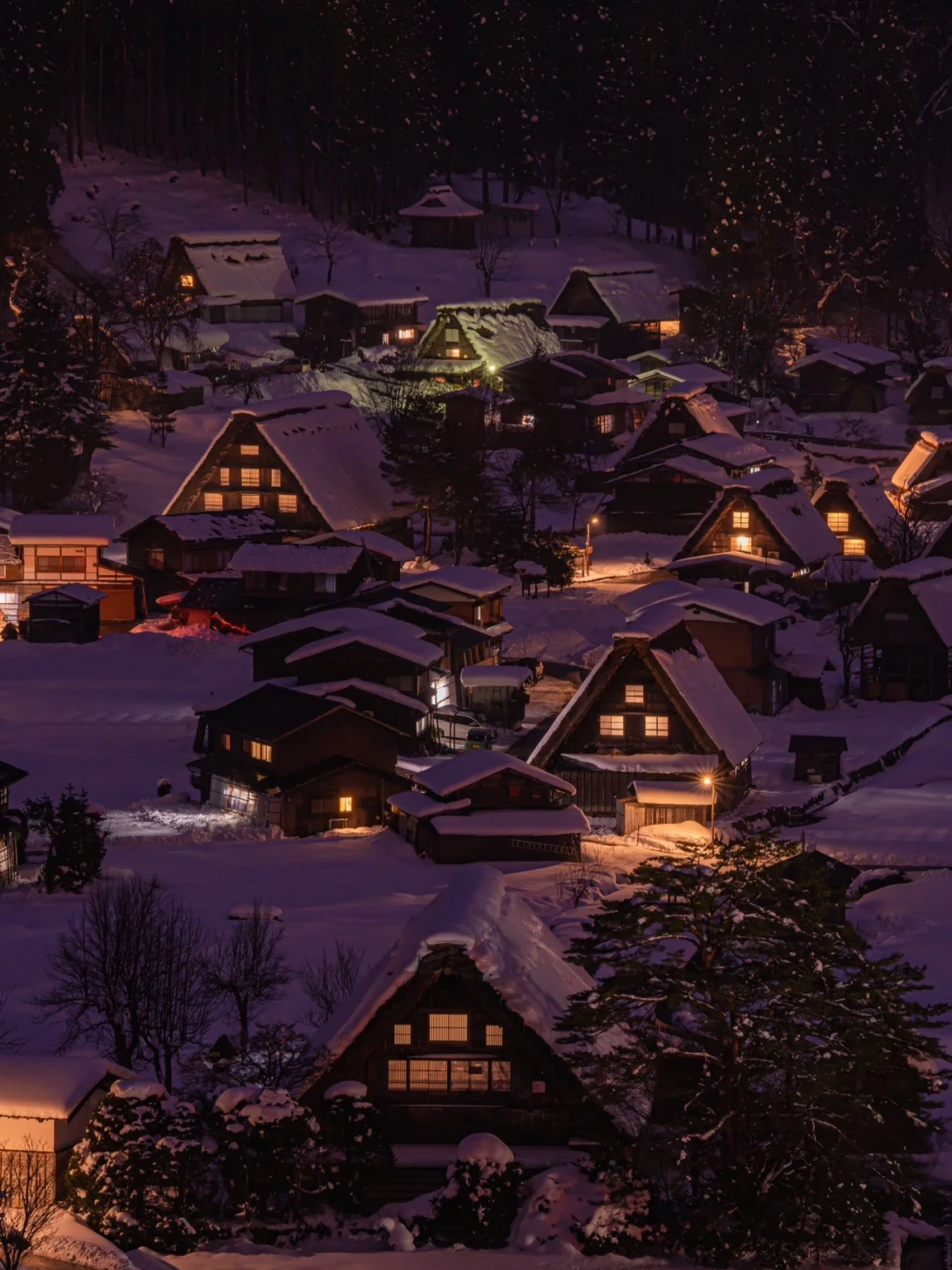 🌈最最受欢迎的大概还是冬天的景色吧。每年年初,白川乡都会举行盛大的点灯仪式,吸引来自五湖四海的摄影爱好者。银装素裹下的合掌造配合着温暖的灯光,简直就是童话世界。