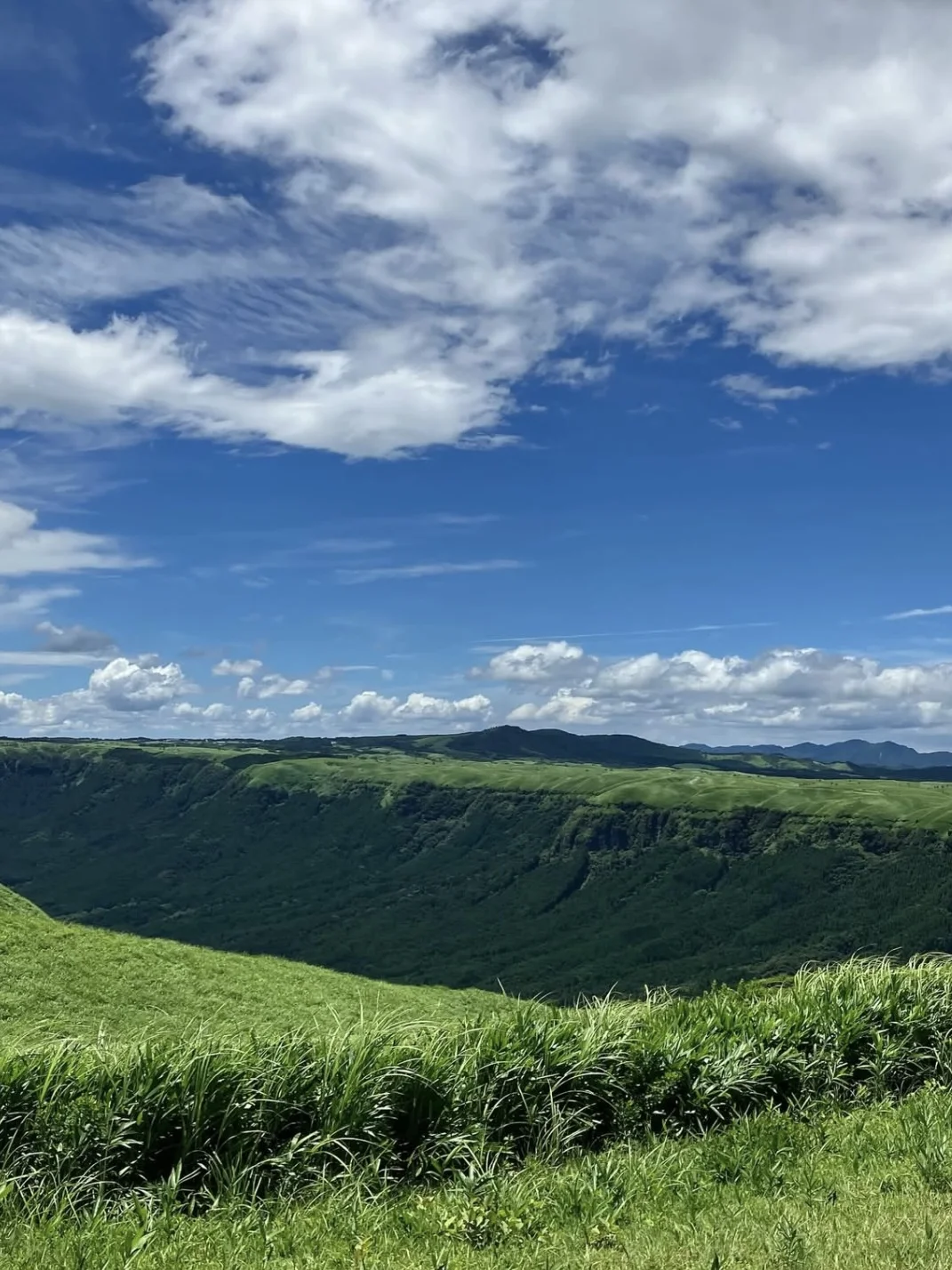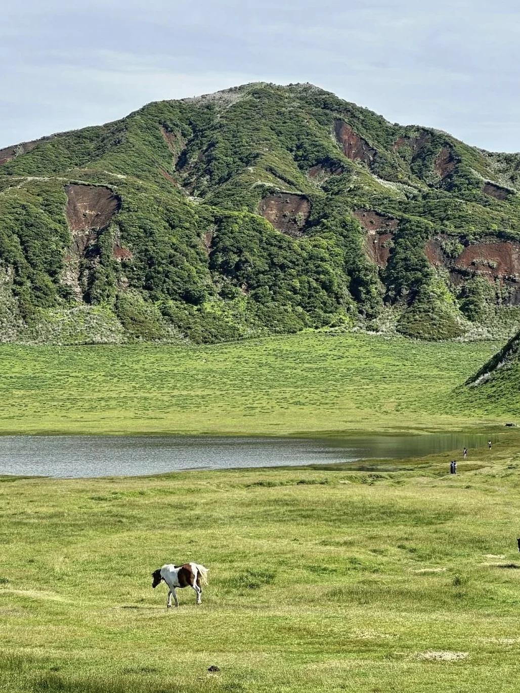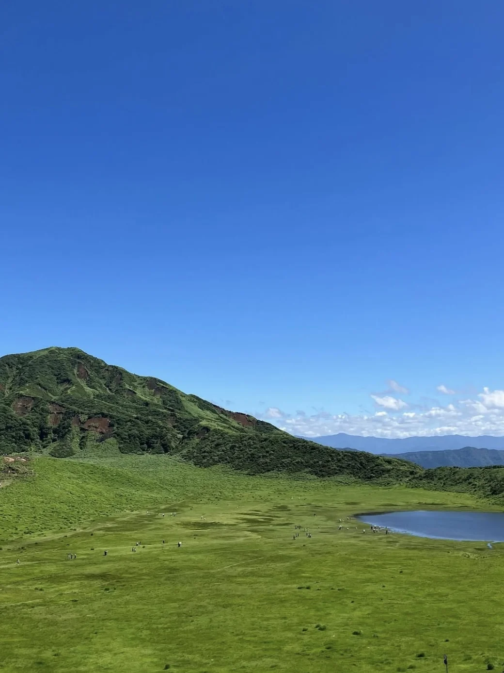 🚗 从熊本市出发,不到2小时车程,一路都是绵延的绿丘与牧场,成群的马和牛在草原悠闲地吃草,背后是壮阔的火山群。