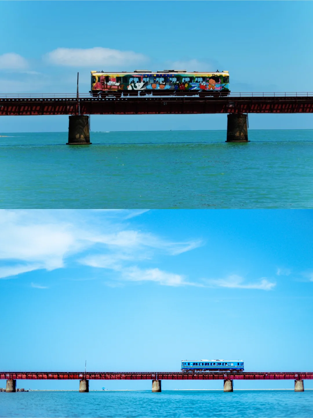 [彩虹R]这里是京都一个安静人不多的景点,远离热闹嘈杂的都市喧嚣,感受童话美景就可以来这里。京都丹后铁道的“电车”,驶过由良川桥梁的时候,仿佛从海面经过,置身于广阔的天海间,吸引很多很多的游客前来摄影;看着电车缓缓在天海间行驶的画面,不由得想起千与千寻里面的电车呢,超美的画面像童话、像插画、像想象中的世界。