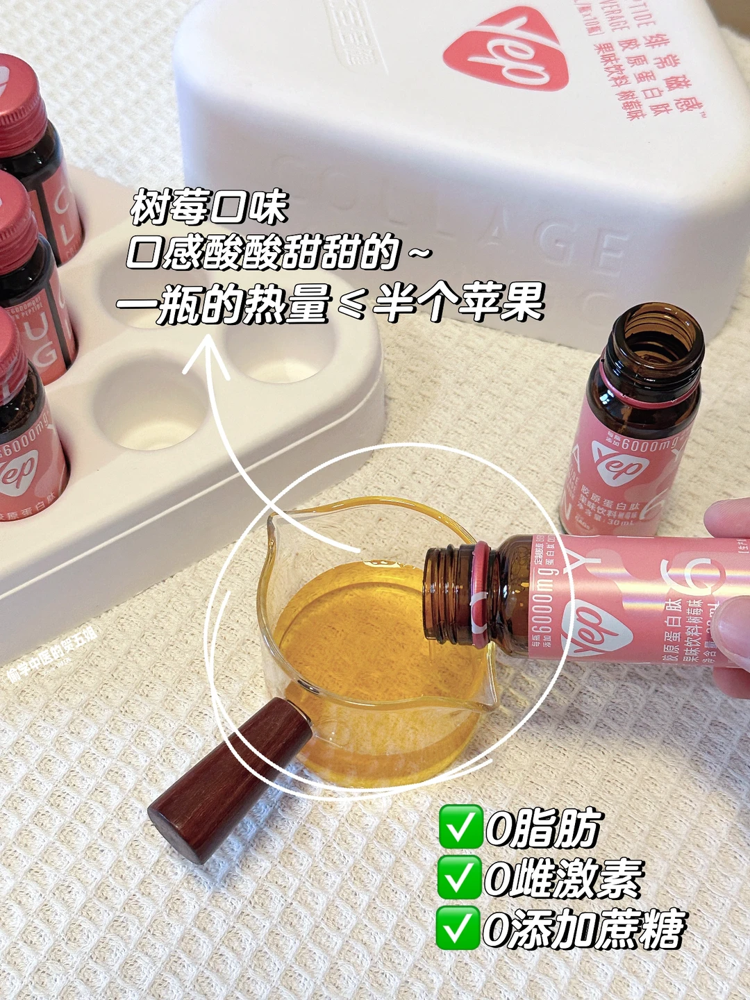 关键它0脂肪0雌激素0添加蔗糖[色色R][色色R]树莓口味,口感酸酸甜甜的~一瓶的热量≤半个苹果,给肌肤补充营养的同时,无任何负担哦~