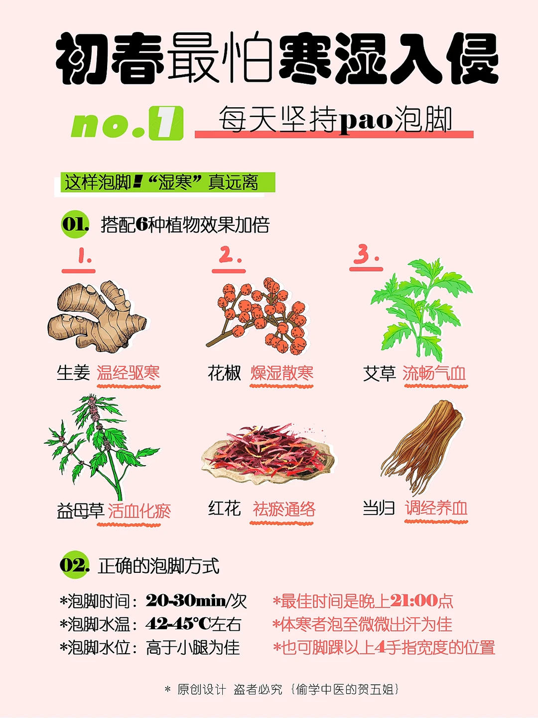 ✅每天坚持泡脚:搭配生姜、花椒、艾草、红花等对排湿寒事半功倍哦~每天坚持泡20分钟左右~体寒者泡至微微出汗为佳