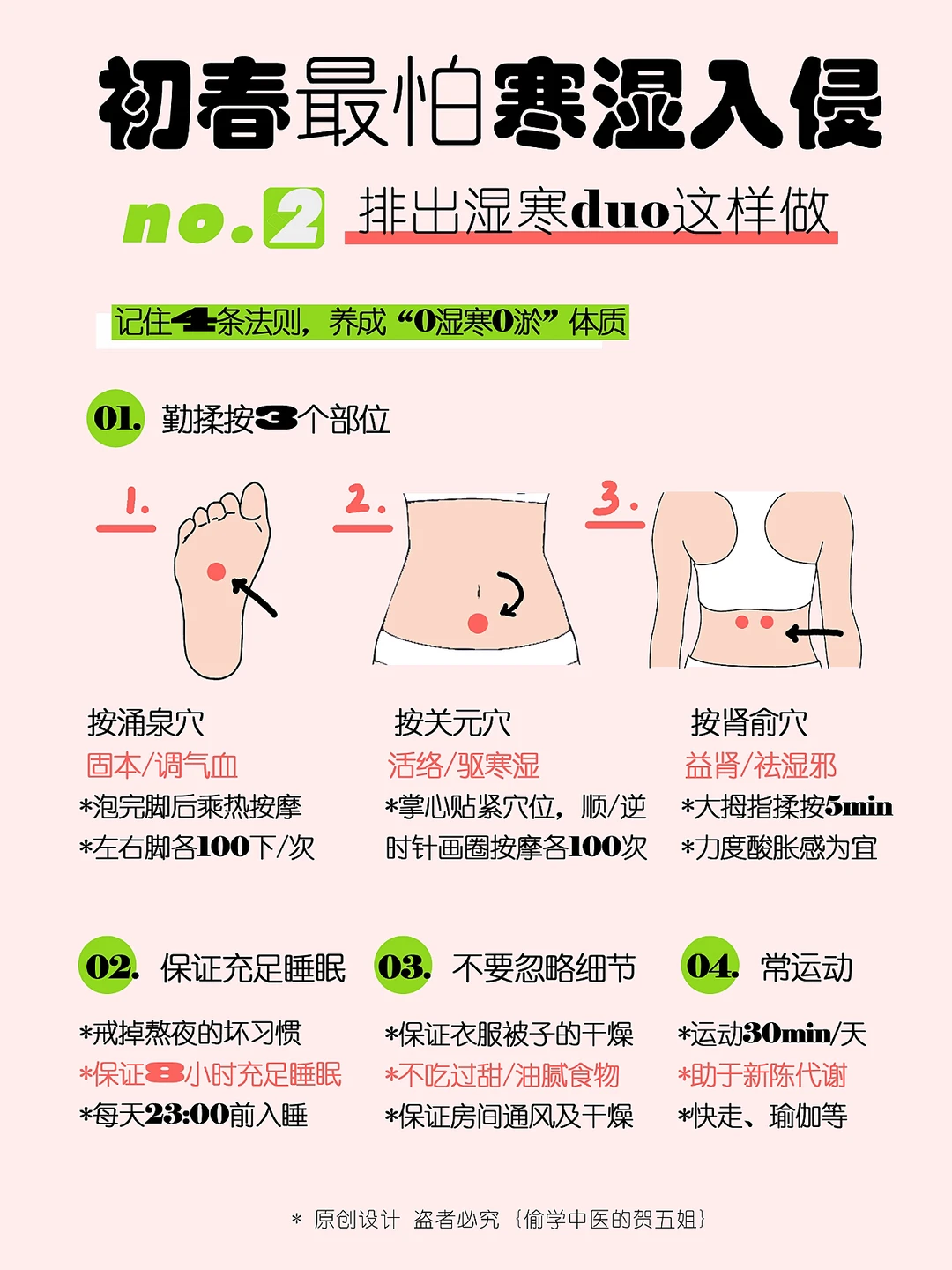 ✅勤揉3个穴位:涌泉穴、关元穴、肾俞穴,每天花3-5分钟按一按它们,能祛寒湿、调气血哦~