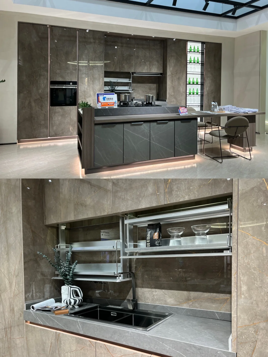 ✨厨房在家里是重要的区域,值得用心去设计。“魅颜”系列的整体厨房,橱柜和门板都是用的意大利深灰岩板,台面是无缝箱体结构,开放式空间一览无余。hin喜欢它吊柜里的升降拉篮,轻轻感应就会下降,拿取相当方便,细节中看到了品质。