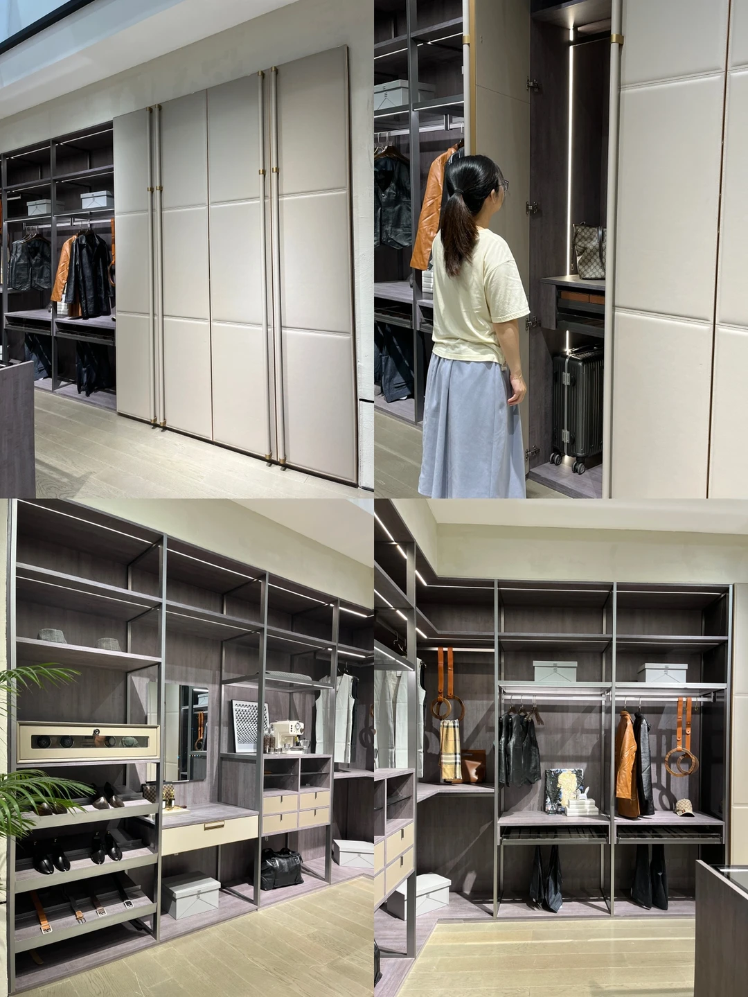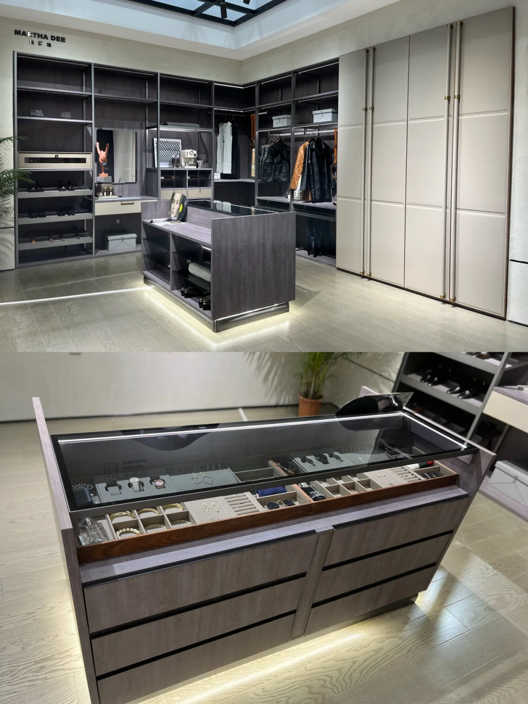 ✨衣帽间应该是蕞让女生沉迷的地方了吧!“玛莎迪”系列的衣帽间,看一眼就挪不开眼睛了~手工质感的通高皮革门板,现代又摩登。衣柜布局体现了各种收纳巧思,悬挂区、抽屉区、叠放区收纳美衣和包包。中间的岛台,装了各种小而精致的东西,收纳成为了艺术。