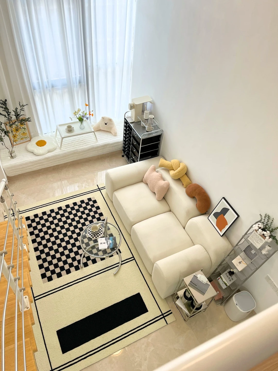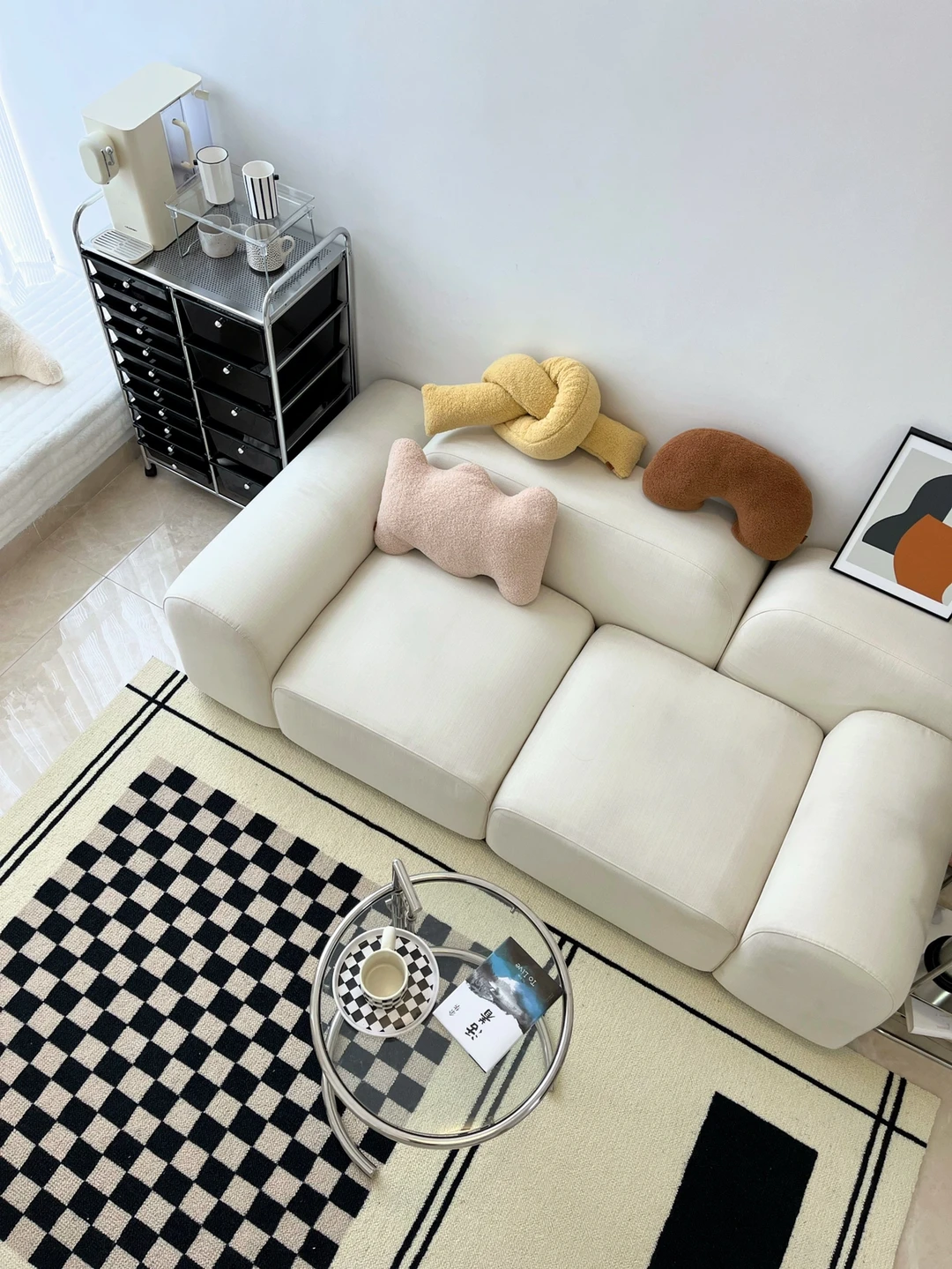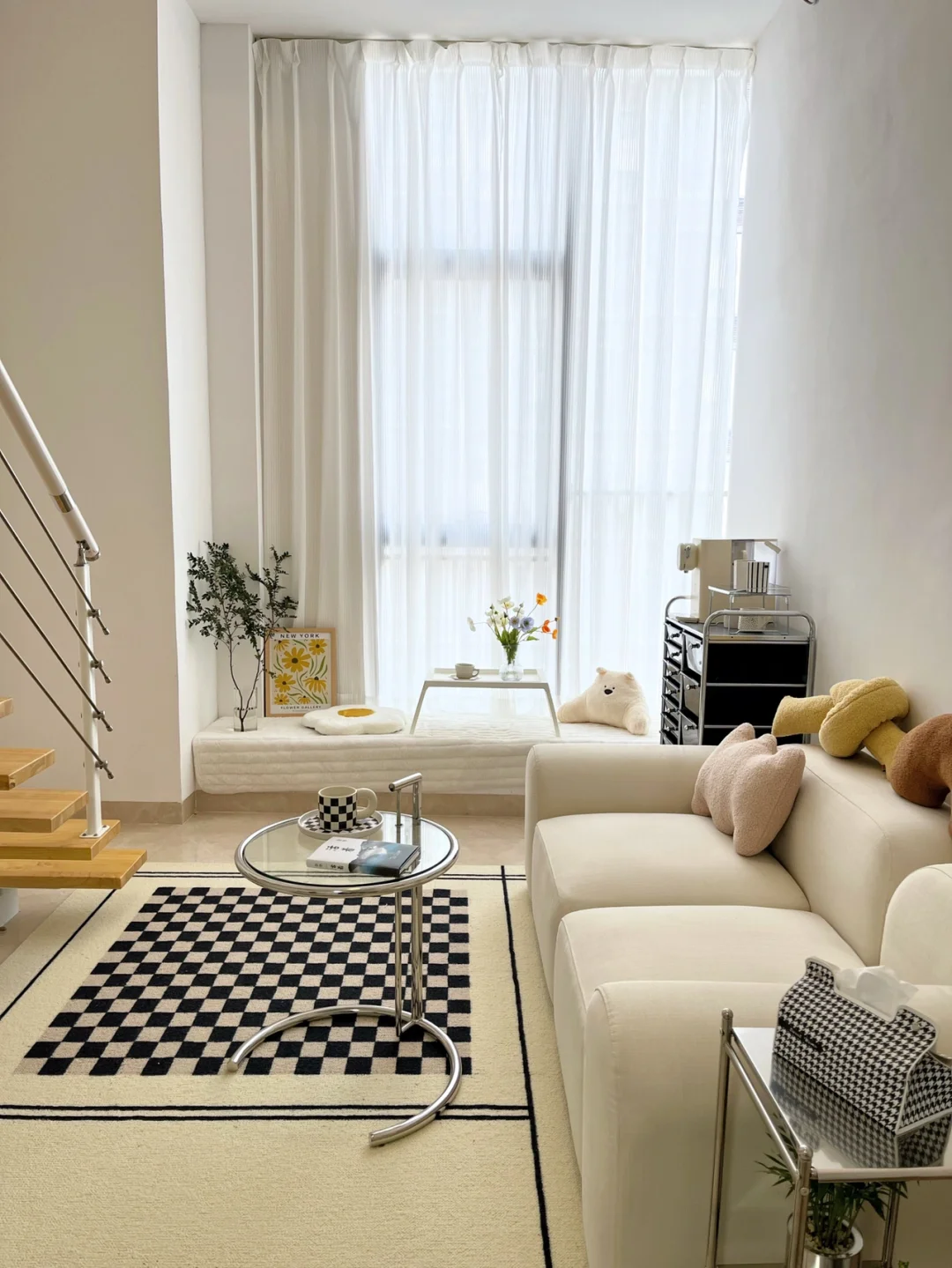 真的越来越喜欢❤️棋盘格了,黑白棋盘格地毯,有一样喜欢的宝子吗?搭配玻璃茶几、中古杂志架和自己DIY的包豪斯边几,这里就是美剧里的时尚公寓~
