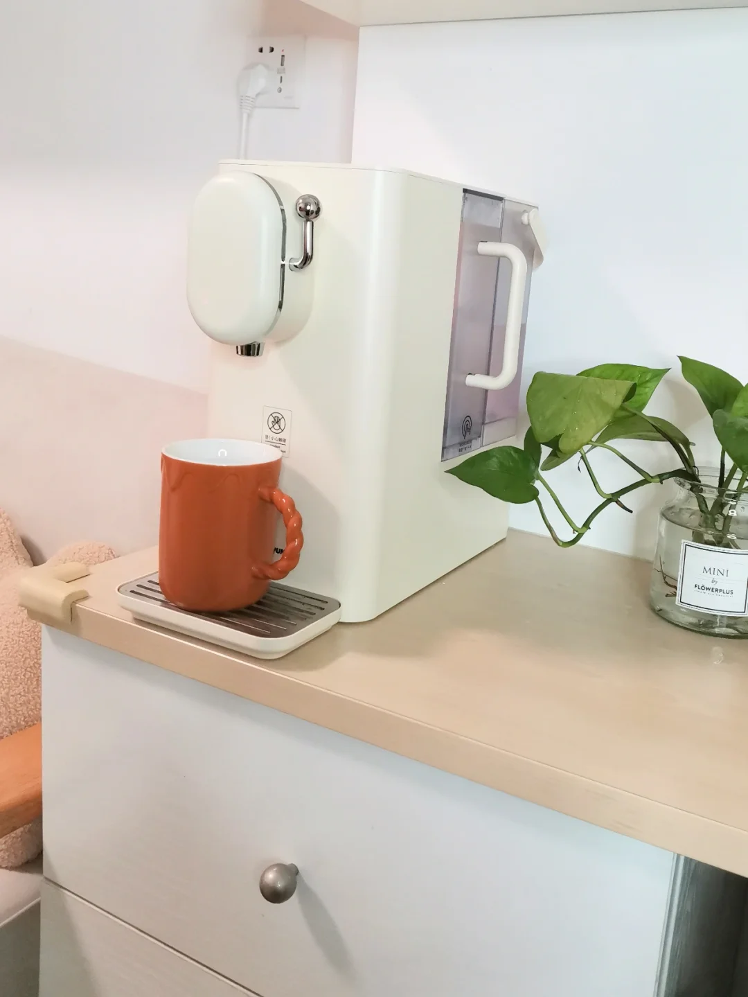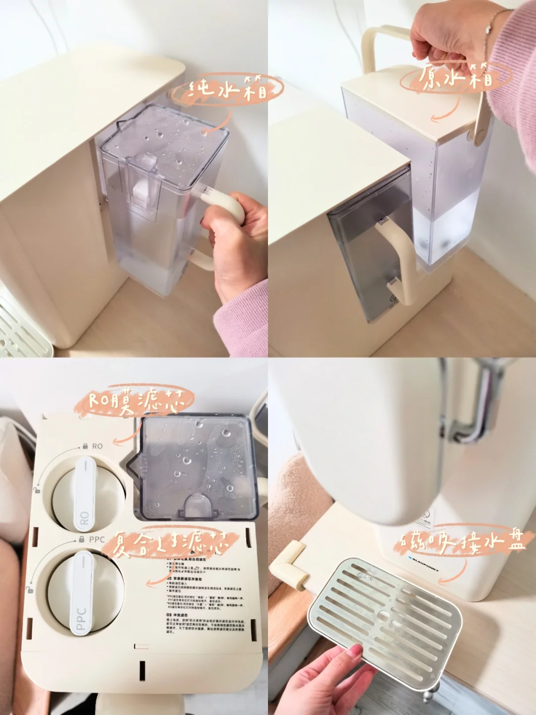 ✔️饮水机里面自带的进口反渗透RO膜滤芯,可以过滤自来水中重金属,抗生素等杂质,过滤出来的水口感很好,可以直饮~老公爱喝凉水,平常直接抽出净水箱直接倒,可以当水壶用。