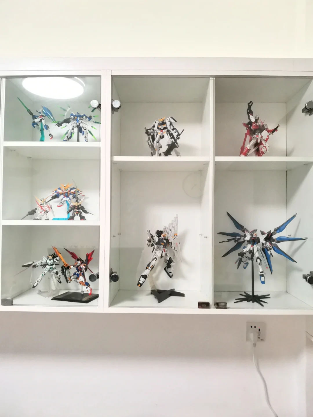 柜子是定制的,离地高度140cm,深度30cm,中间层板可以取下来,柜门是按压式的玻璃门,放高达和手办都可以,也算是沙发墙这边的特色装饰了。