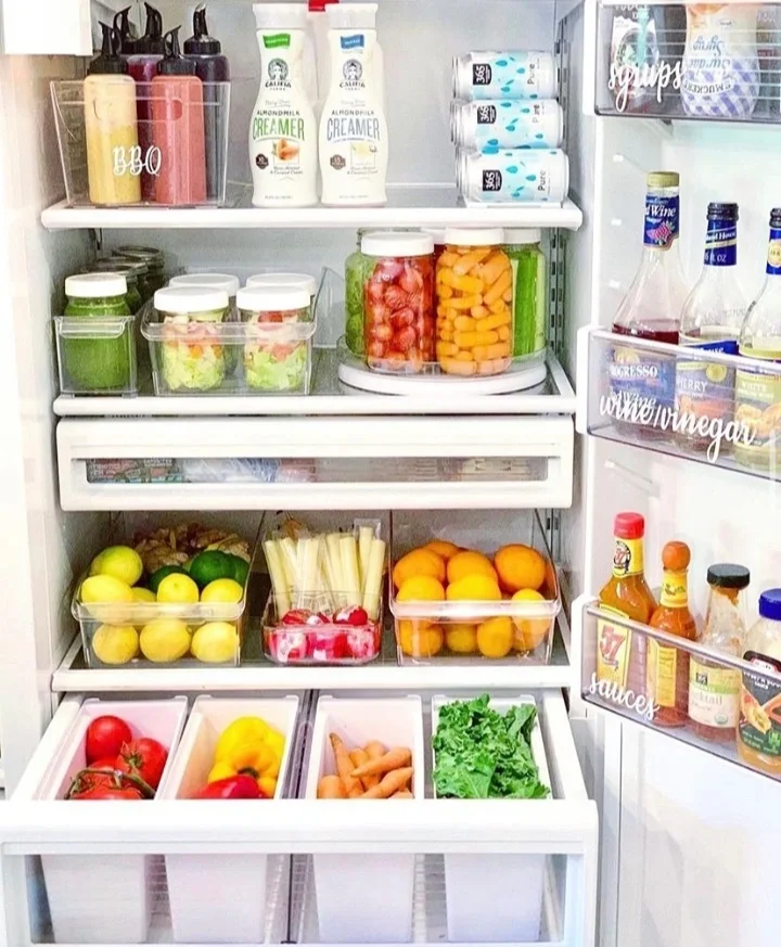 图4 冰箱利用收纳盒摆放蔬菜、水果、饮料,整齐不乱