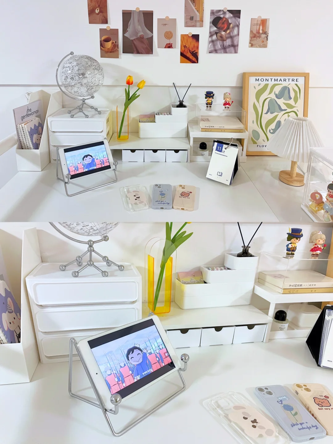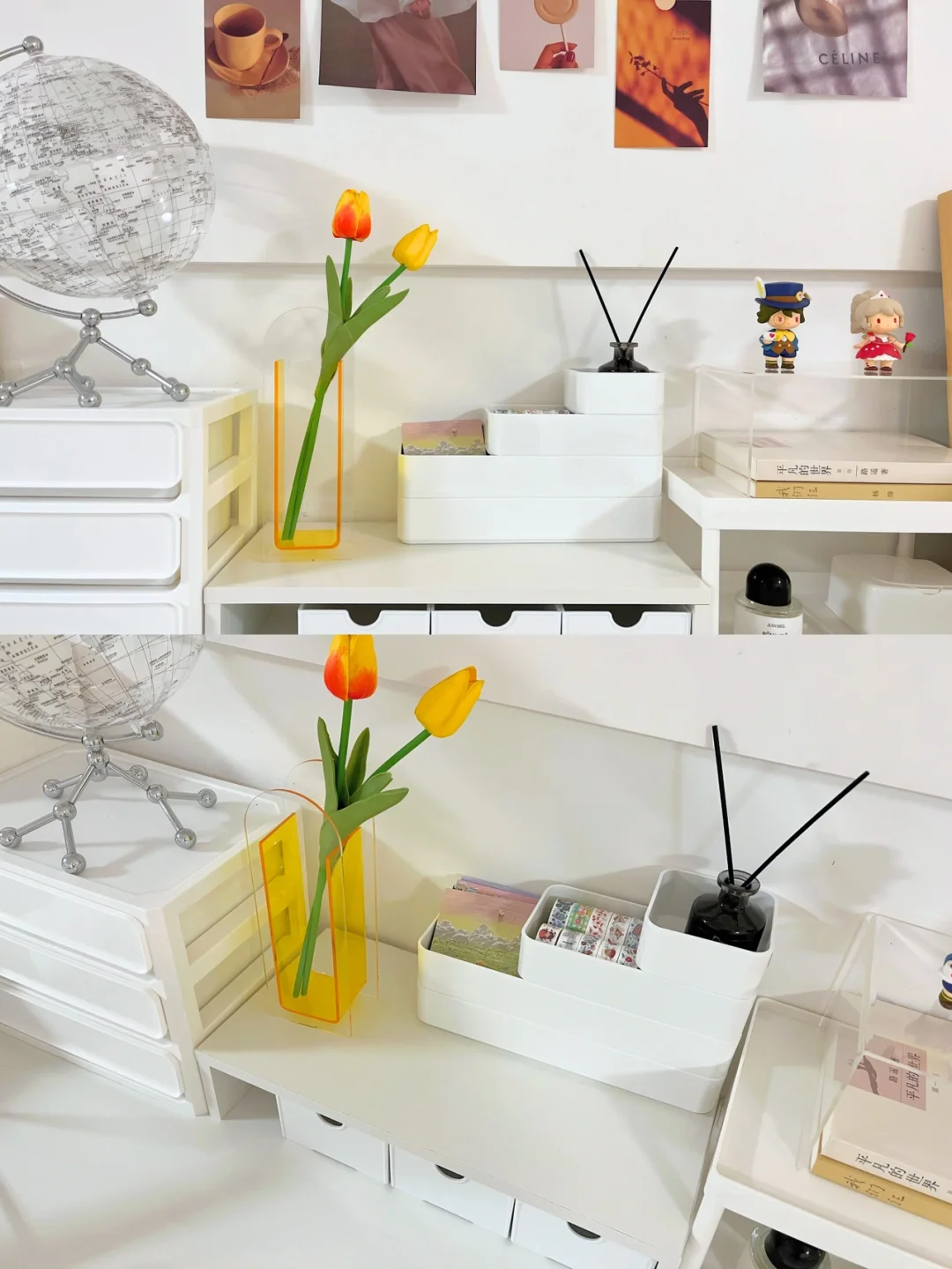 桌面是各种无印风白色or透明收纳盒,🐶奶fufu的,不仅好看,还巨能收纳~