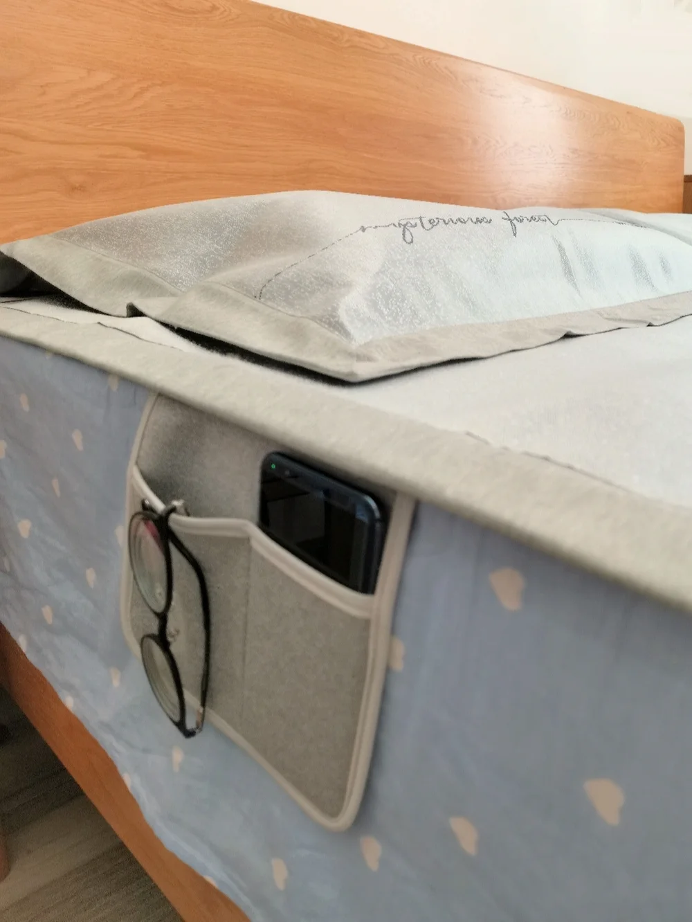边上还有个小兜可以放手机📱、眼镜👓、遥控器。小物件在床边有他的专用位置收纳了,再也不会东寻西觅、翻箱倒柜了