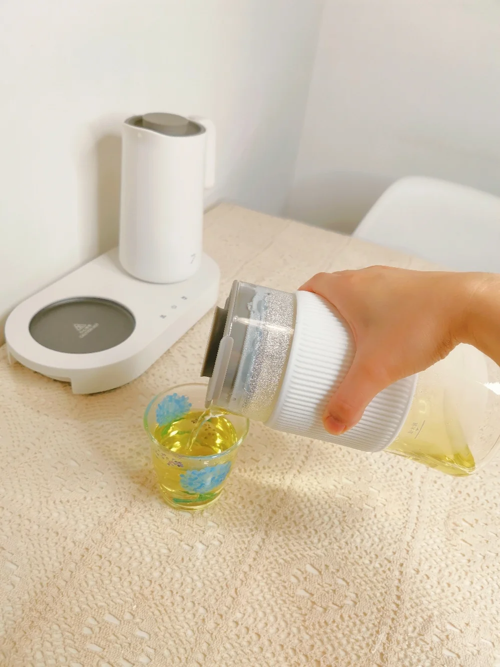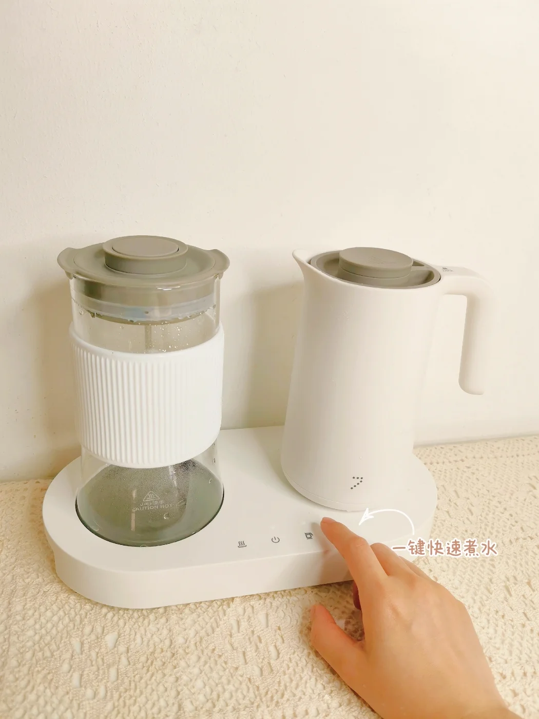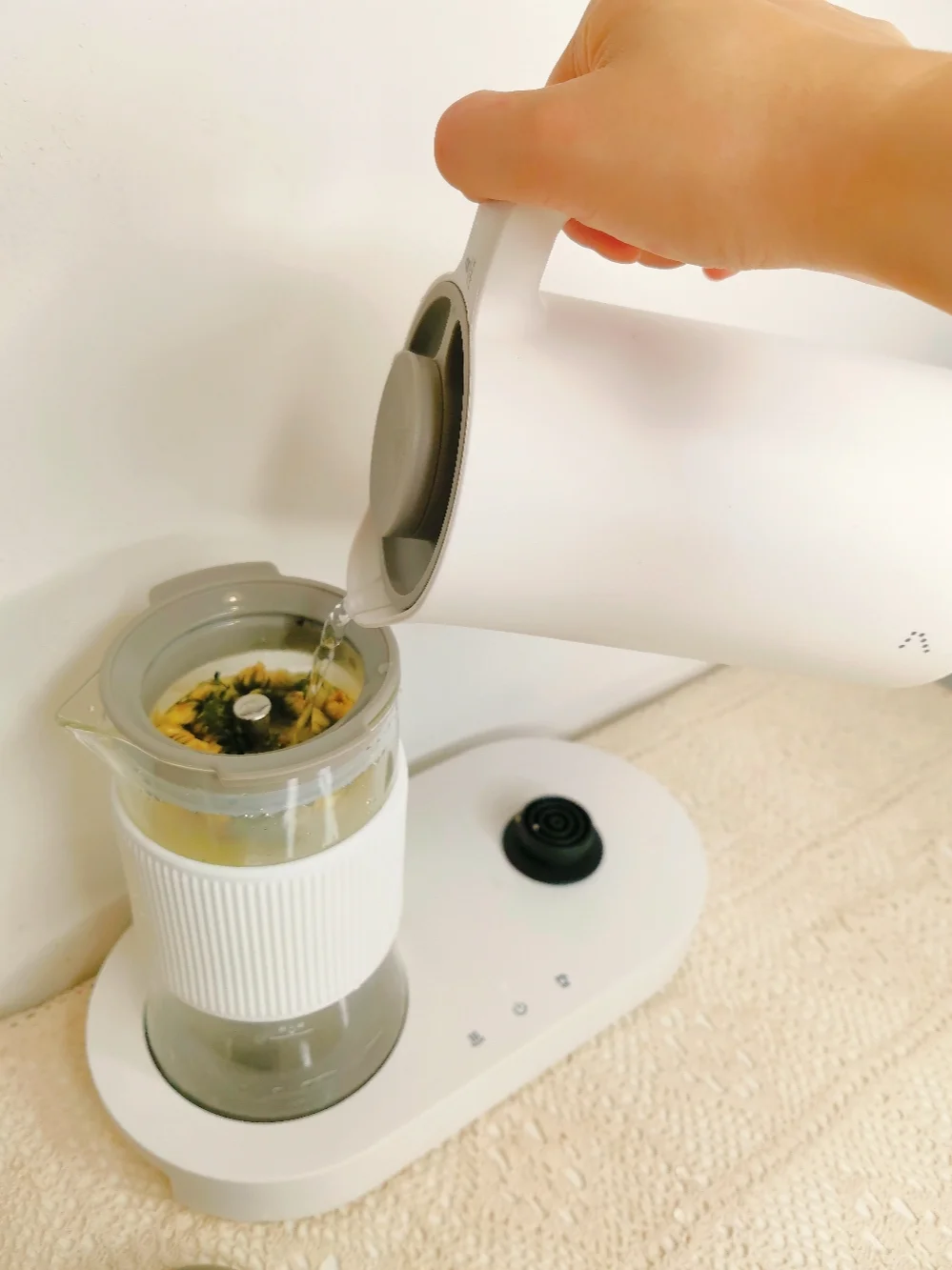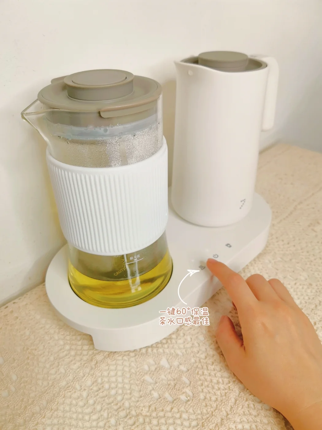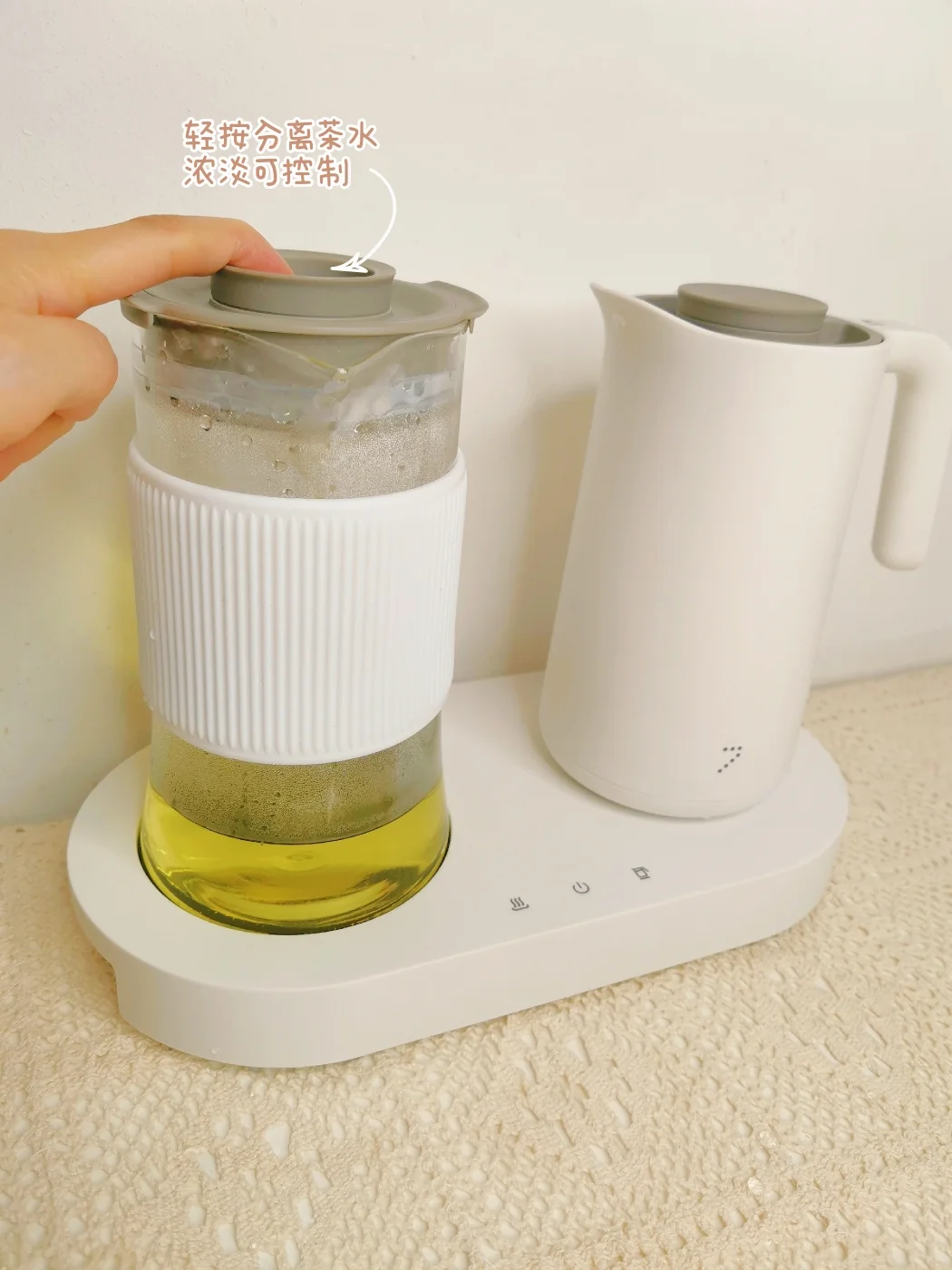 一边煮水💦,一边泡茶🍵,等茶泡开之后轻按一下茶壶顶的按键,就可以滤出茶水。