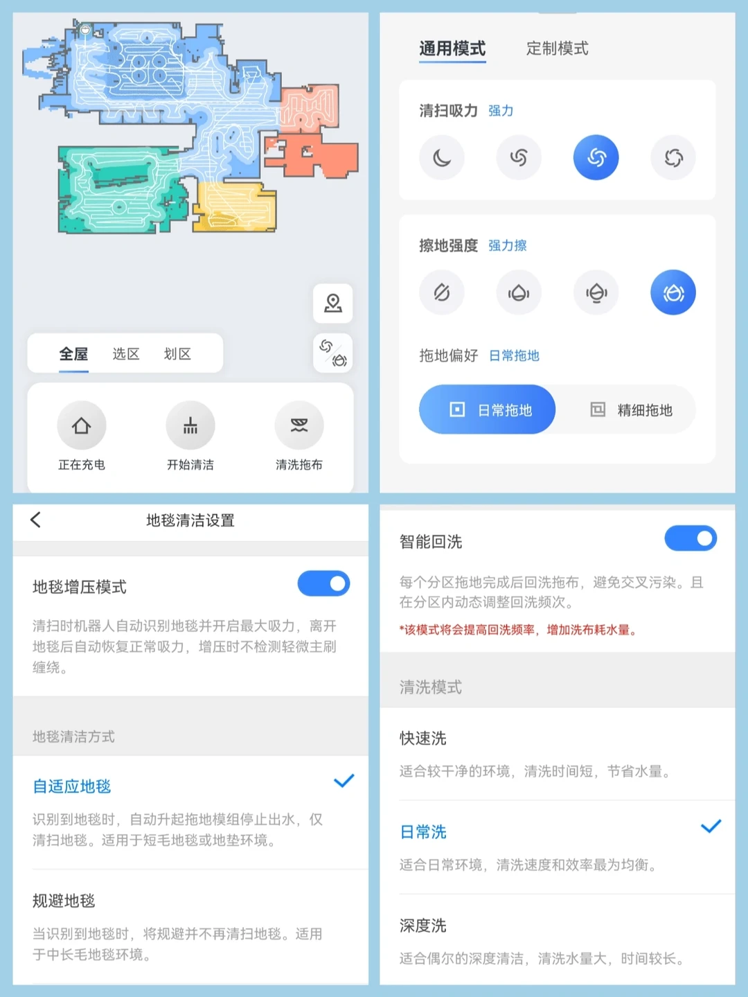 ✔️它的建图速度又快又准,用app操作可以选择选区清洁或划区清洁,还可以设置清洁吸力和拖布强度、回洗时间和回洗模式等等,简单方便。