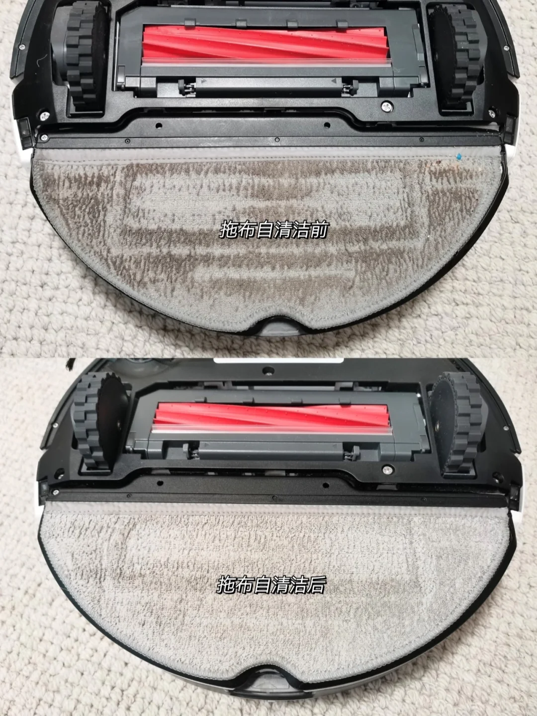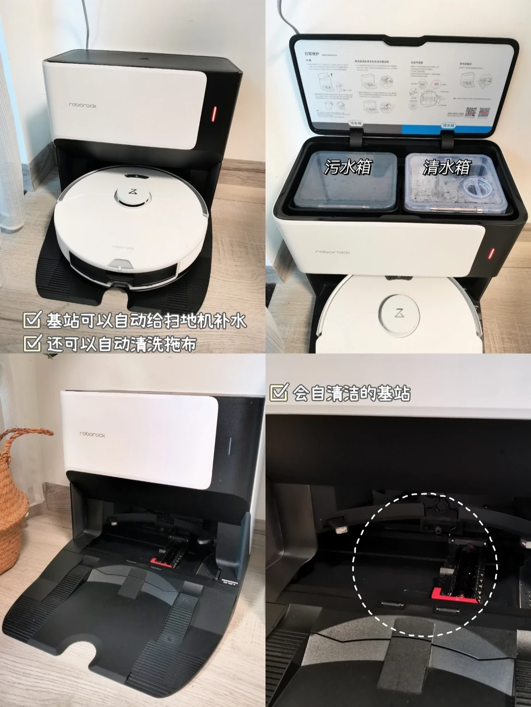 🤗嘿嘿~它还会自动回基站清洗拖布哦,基站也会自动清洁,每次打扫只需要装上清水,清扫完倒掉污水就可以啦,全程不脏手。