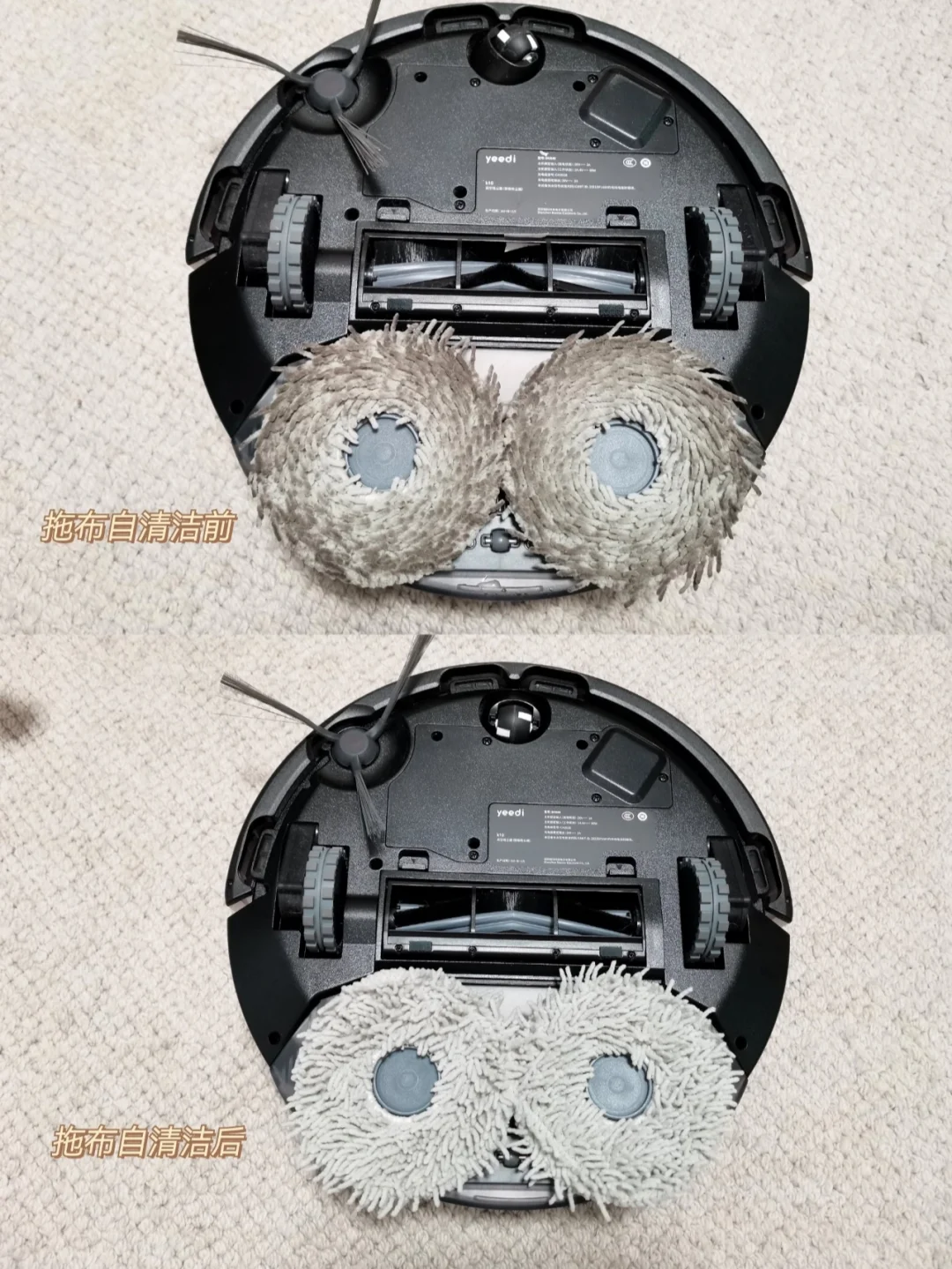 ✨它是扫吸拖洗干一体的,一边扫地的同时还能拖地,拖地模拟人手压在地上打圈强擦,还能拖布自动回洗这点真心赞哇!