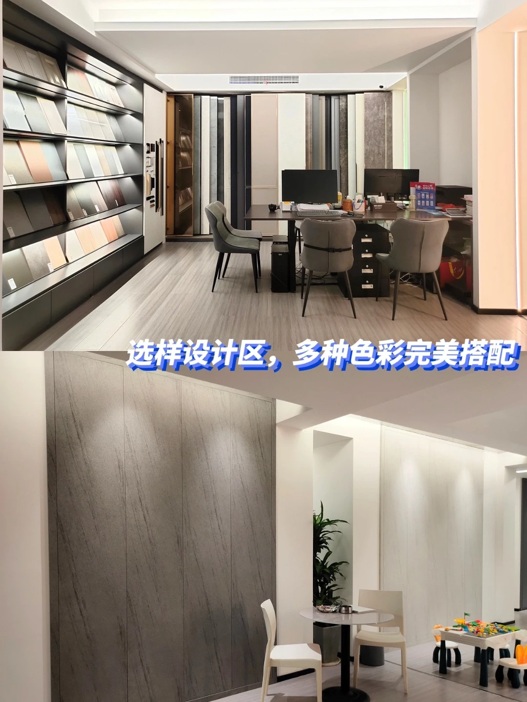 我们还参观了选样设计区,里面设有色板柜,还有不同门型款式;一些新款花色整体上墙效果也是一目了然,还可以在这里喝和设计师面对面沟通,从色彩搭配、功能布局设计师都给到不少贴心建议,体验感非常帮,建议有装修计划的集美们可以亲自去联邦高登的实体店感受一下,会有意想不到的惊喜~