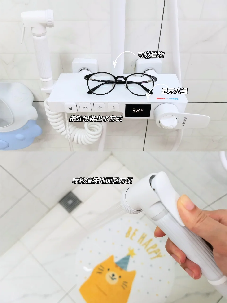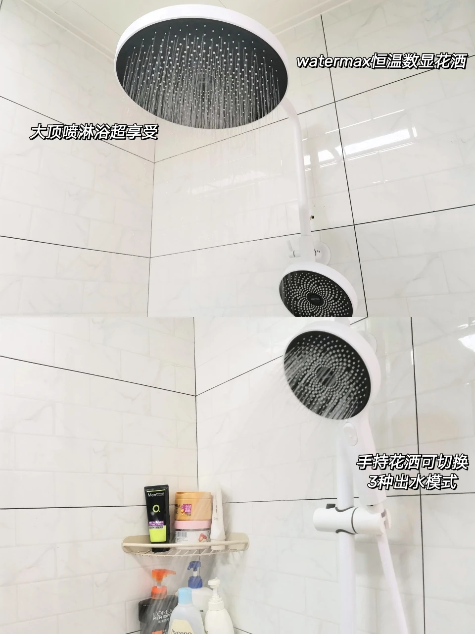 以前洗澡水温总是忽冷忽热,上个月换的恒温花洒“真香”~现在广州夏天这么热,用38°C水洗澡真的太舒服啦~这个花洒全身白色满满的高级感!手持花洒有3挡调节,大顶喷淋浴超享受的,喷枪清洁地面也是妥妥的好用~