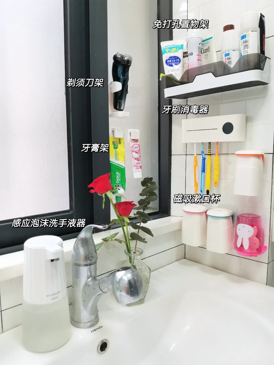 ✔️浴室柜侧面墙也利用起来,都是些平价的免打孔收纳好物,漱口杯、牙刷、牙膏、剃须刀通通上墙。台面不放东西,清洁打理起来容易多了~