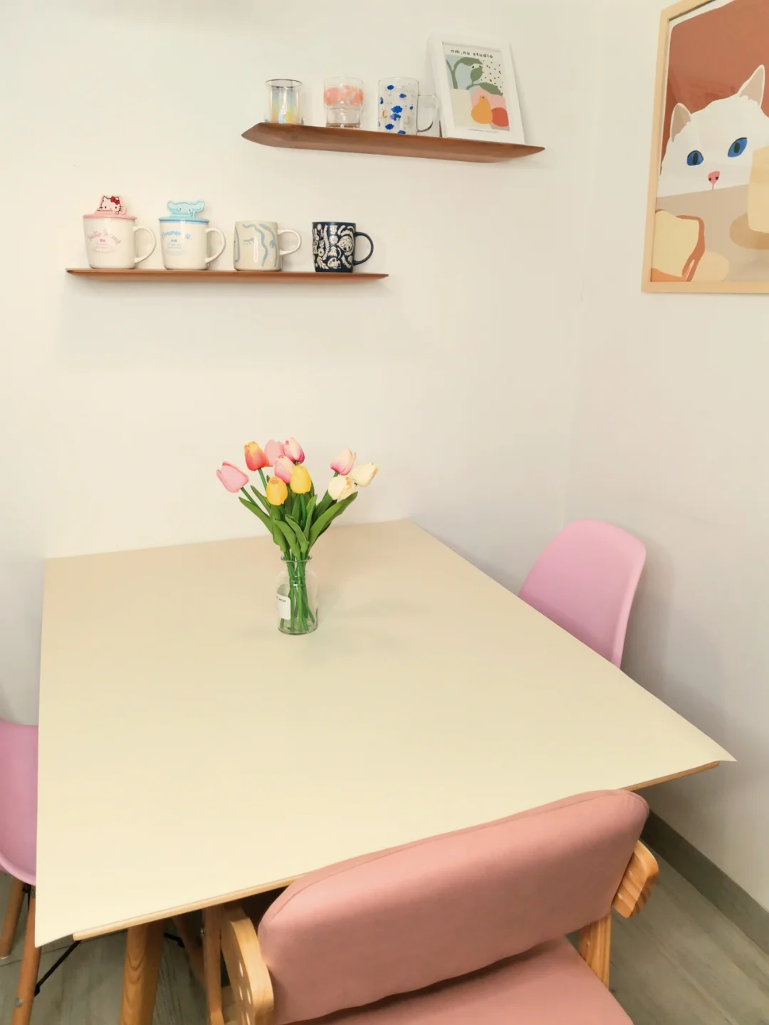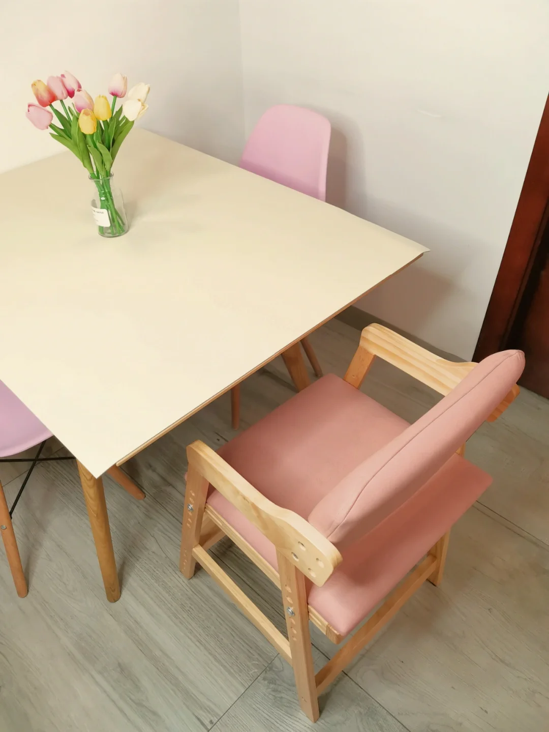换了甜美的🌸奶油色桌垫,简约干净,跟我家原木风格餐厅简直太搭了~材质是防水皮质,非常有质感,👍🏻也hin好打理,一擦就干净哦。