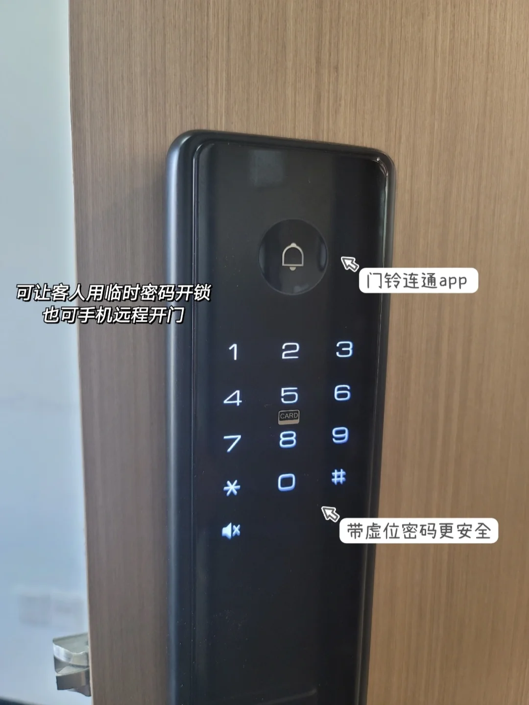 智能锁上还有一个门铃🔔按钮,如果家里来客人了t,他按一下门铃,手机app就会收到,万一我不在家,也可以给他一个临时密码,或者直接用手机远程开锁,让客人先进屋休息。