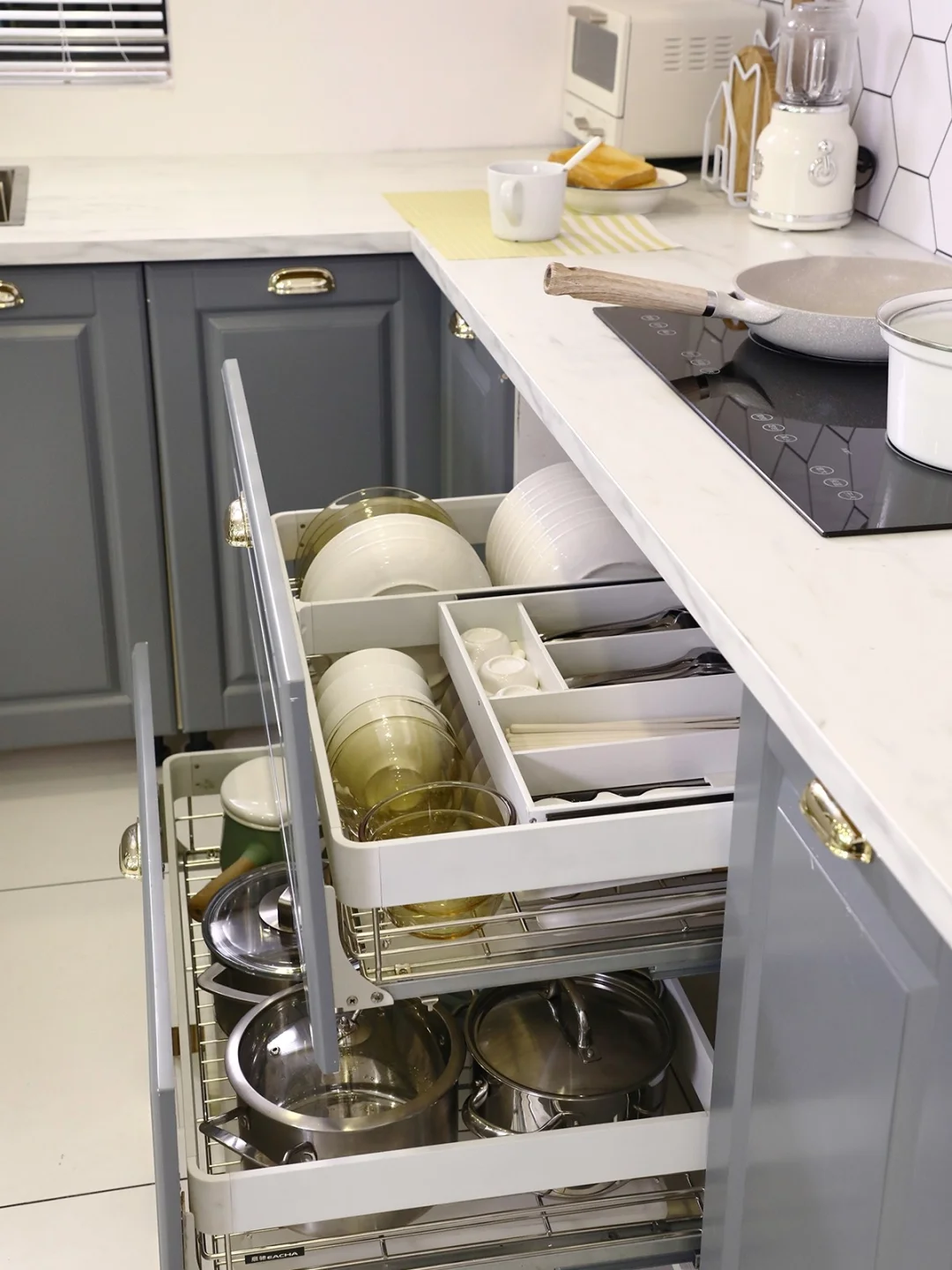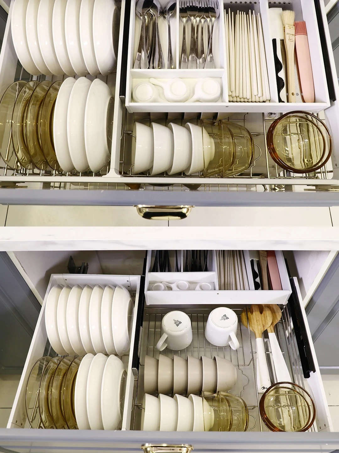 ☑️碗碟拉篮是必不可少的,厨房里一大部分的锅碗瓢盆都是放在这里收纳的。