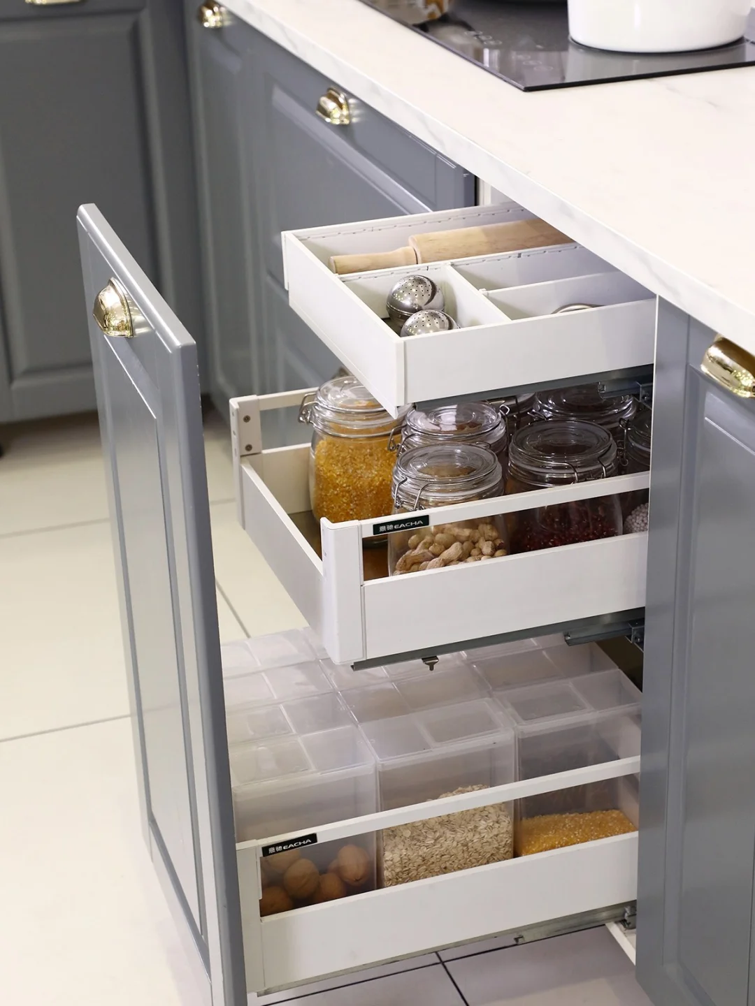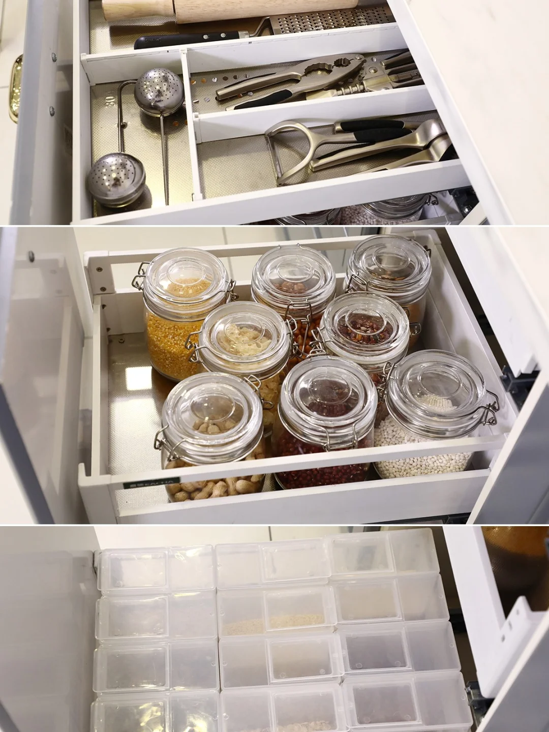 👉🏻往下两层都是平篮收纳空间,一层放储藏五谷杂粮的透明玻璃收纳罐,放在这里更安心,不会不小心打碎一个罐子,还要再整理收拾厨房。