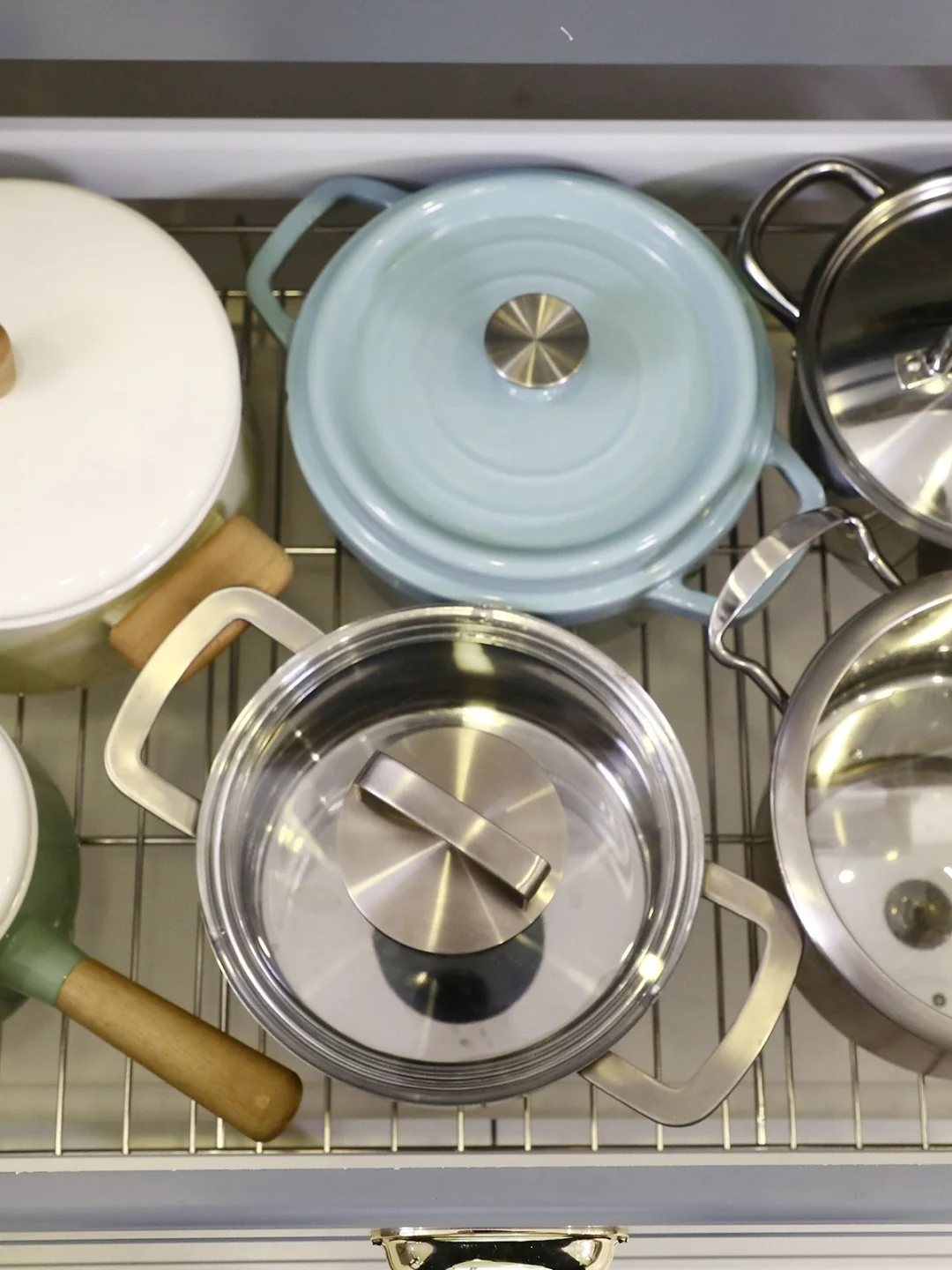 👉🏻最下层的锅具收纳也不能少,占面积的锅具都可以放进这里,减少台面储物压力。