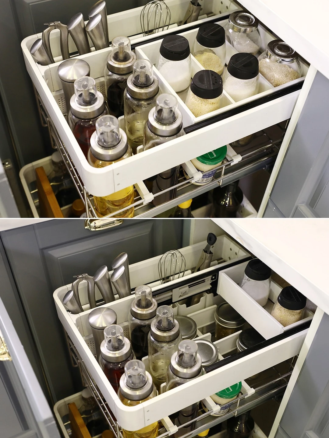 👉🏻上面一层是收纳盒➕小内抽➕平篮的混合收纳,可以拆出来的几个收纳盒还有刀具架,放常用的工具绰绰有余。而多出来的这一层小内抽,空间利用拿捏到位,可以放下好几瓶调味料,还是分格收纳的。最后就是由挡条挡片组成的格子式调料收纳,一个格子一瓶调味料,稳定不晃动,拿取更方便。