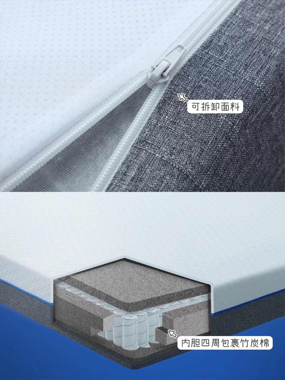 🔹竹炭棉:吸附性强,透气性好,可以吸附和排出水分和异味,净化睡眠环境
