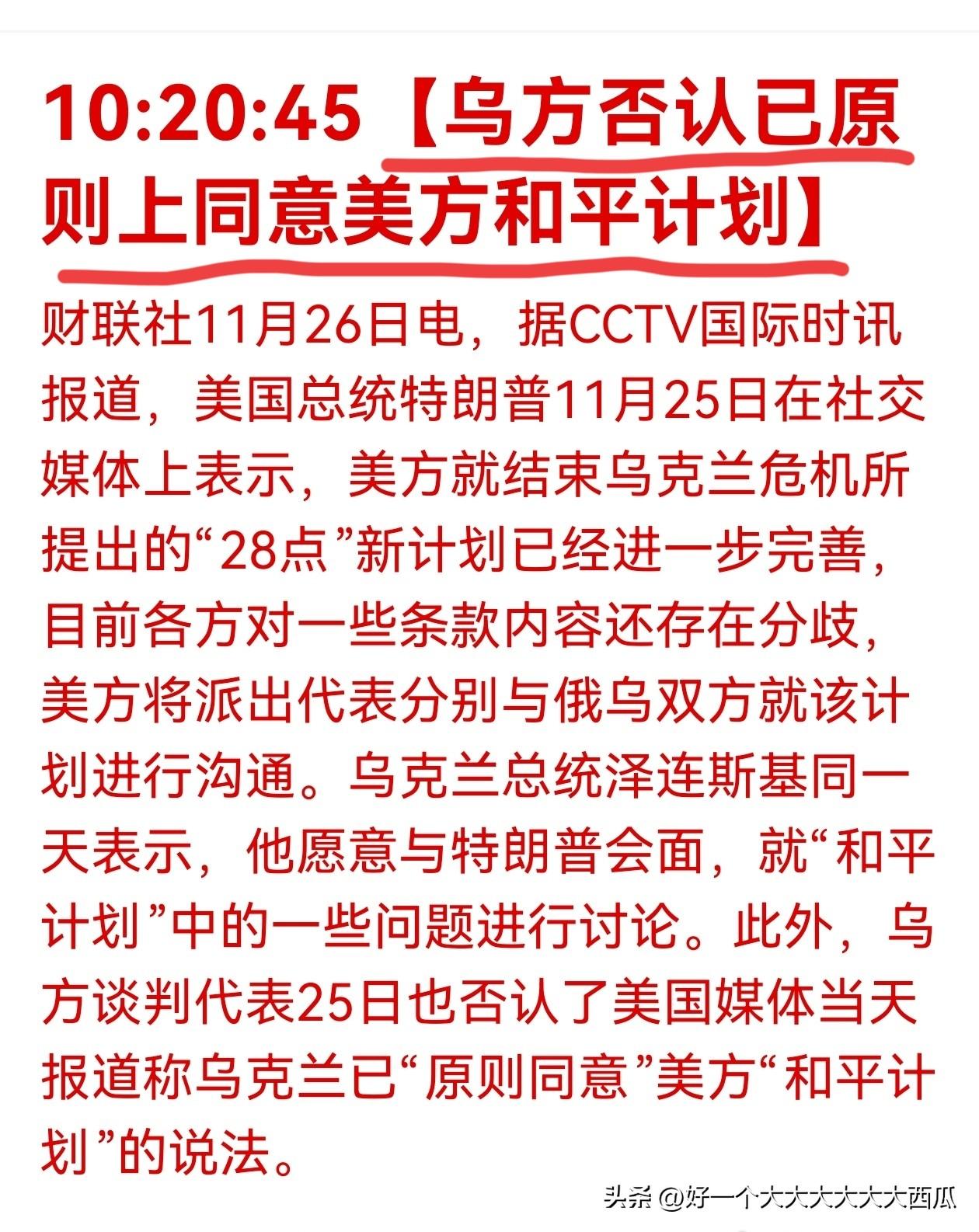 很显然乌克兰并未同意28点和平协议, 毕竟这种近乎于卖国的协议谁敢签谁就是乌克兰真正意义上的罪人, 在后续好几十年甚至上百年都是要背负骂名的, 而且历史教科书上也会记录此事。 泽连斯基这3年都熬过来了, 树立了一个所谓的民族英雄的形象, 你让他这一下子突然人设崩塌, 他应该不会轻易的就这样干。 美乌最新协议