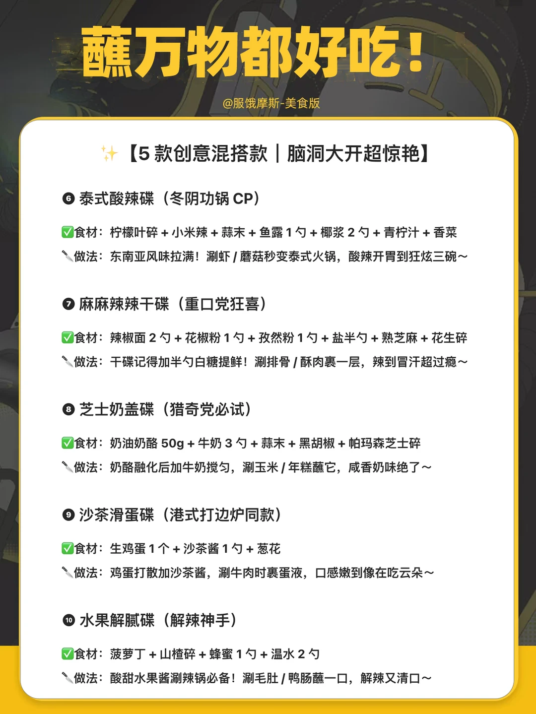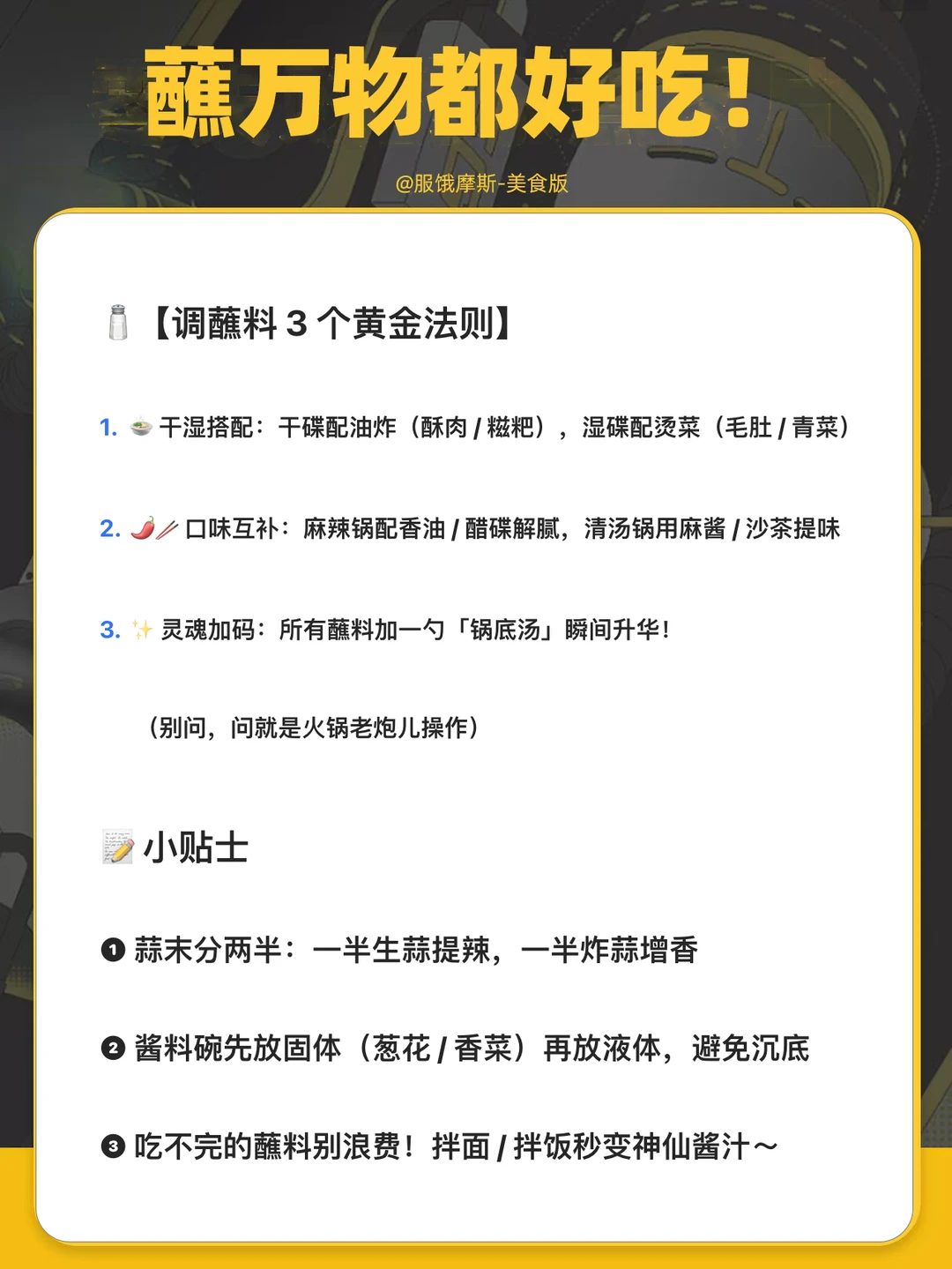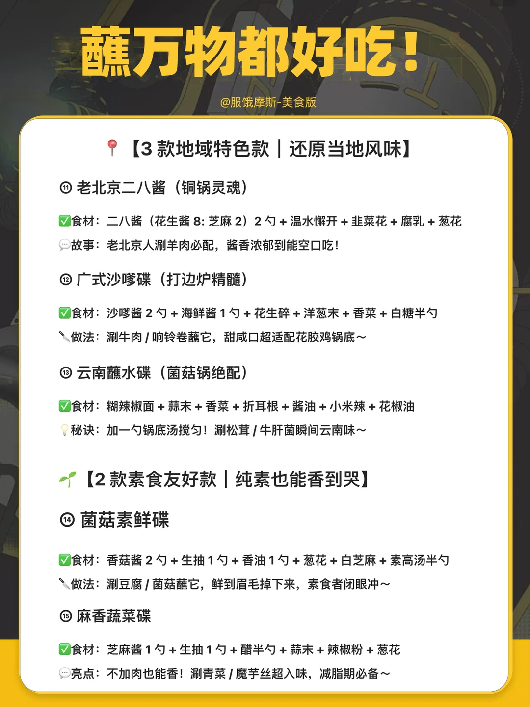 ✅火锅脑袋集合! 整理了 15 款「蘸万物都好吃」的神仙蘸料配方,涵盖经典款、创意款、地域特色款,附调酱小秘诀,让你锅底瞬间升级~收藏这篇直接实现蘸料自由! - 🧂【调蘸料 3 个黄金法则】 1⃣🍲 干湿搭配:干碟配油炸(酥肉 / 糍粑),湿碟配烫菜(毛肚 / 青菜) 2⃣🌶️🥢 口味互补:麻辣锅配香油 / 醋碟解腻,清汤锅用麻酱 / 沙茶提味 3⃣✨ 灵魂加码:所有蘸料加一勺「锅底汤」瞬间升华! - (别问,问就是火锅老炮儿操作) -