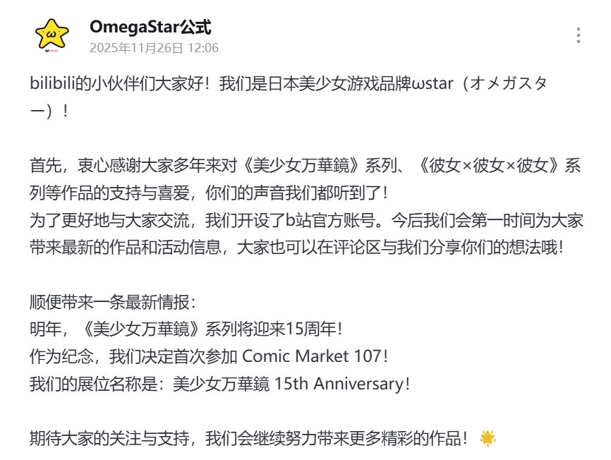 《美少女万华镜》系列开发商ωstar也入驻B站了