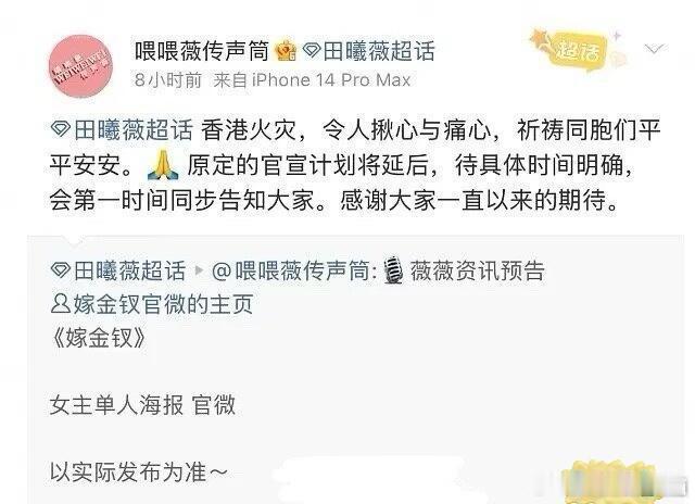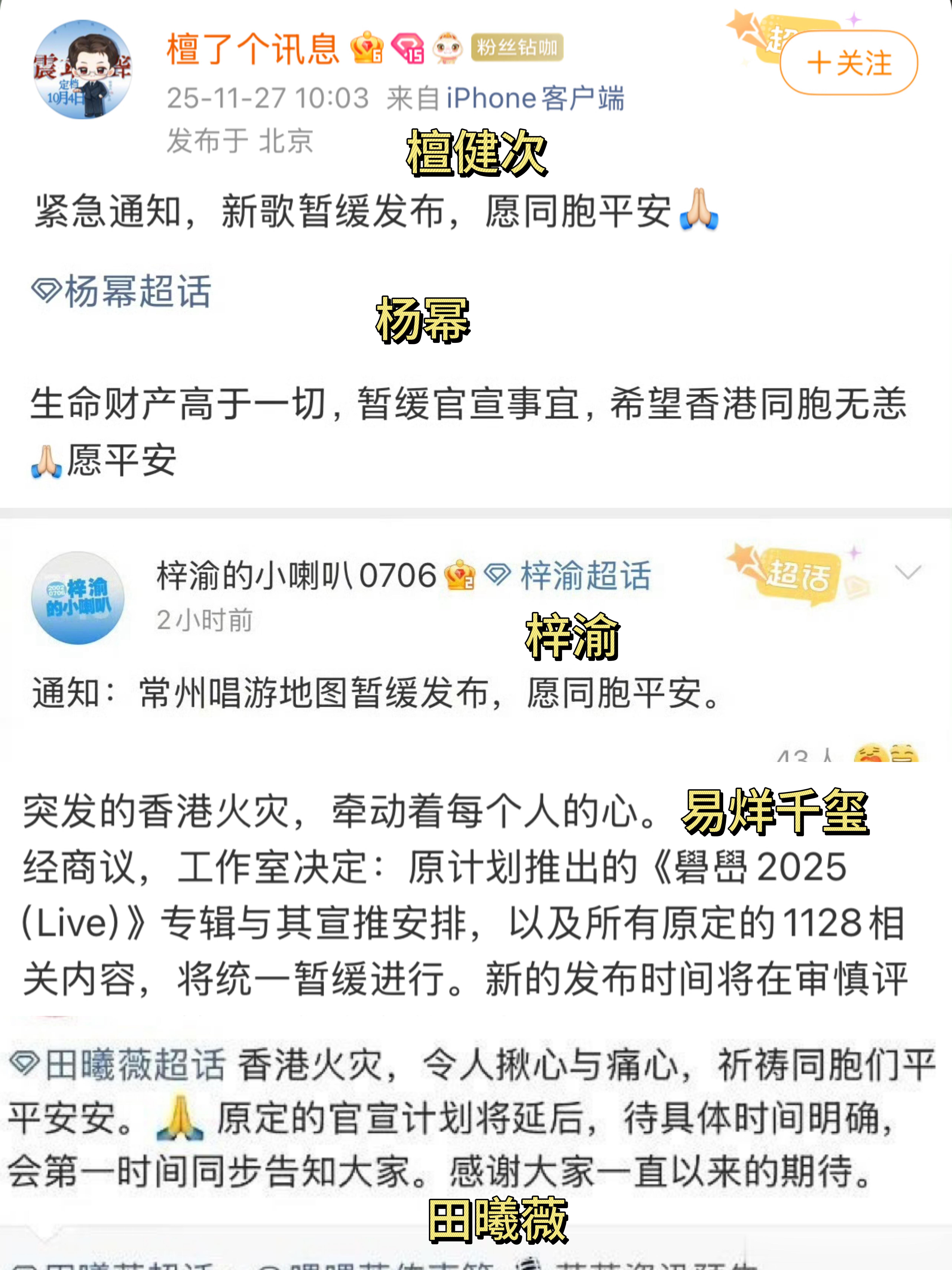多位艺人暂缓官宣杨幂 梓渝 易烊千玺 田曦薇 檀健次 杨紫琼 周润发等多名艺人,因香港火灾,暂缓官宣🙏🏻杨幂暂缓官宣Prada代言人檀健次暂缓官宣新歌发布易烊千玺暂缓官宣专辑与生日相关内容田曦薇暂缓官宣新剧梓渝暂缓官宣活动杨紫琼、周润发不出席MAMA港迪取消《疯狂动物城2》首映礼等活动🙏🏻愿同胞平安🙏🏻
