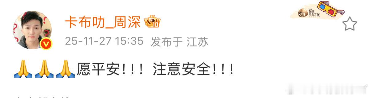 周深捐款100万驰援香港香港大埔宏福苑火灾令众多家庭受灾,周深用实际行动支持灾区,他通过复星公益基金会捐款100万元,用于火灾后的紧急救援与家园重建。致敬所有奋战在一线的英雄,盼平安。