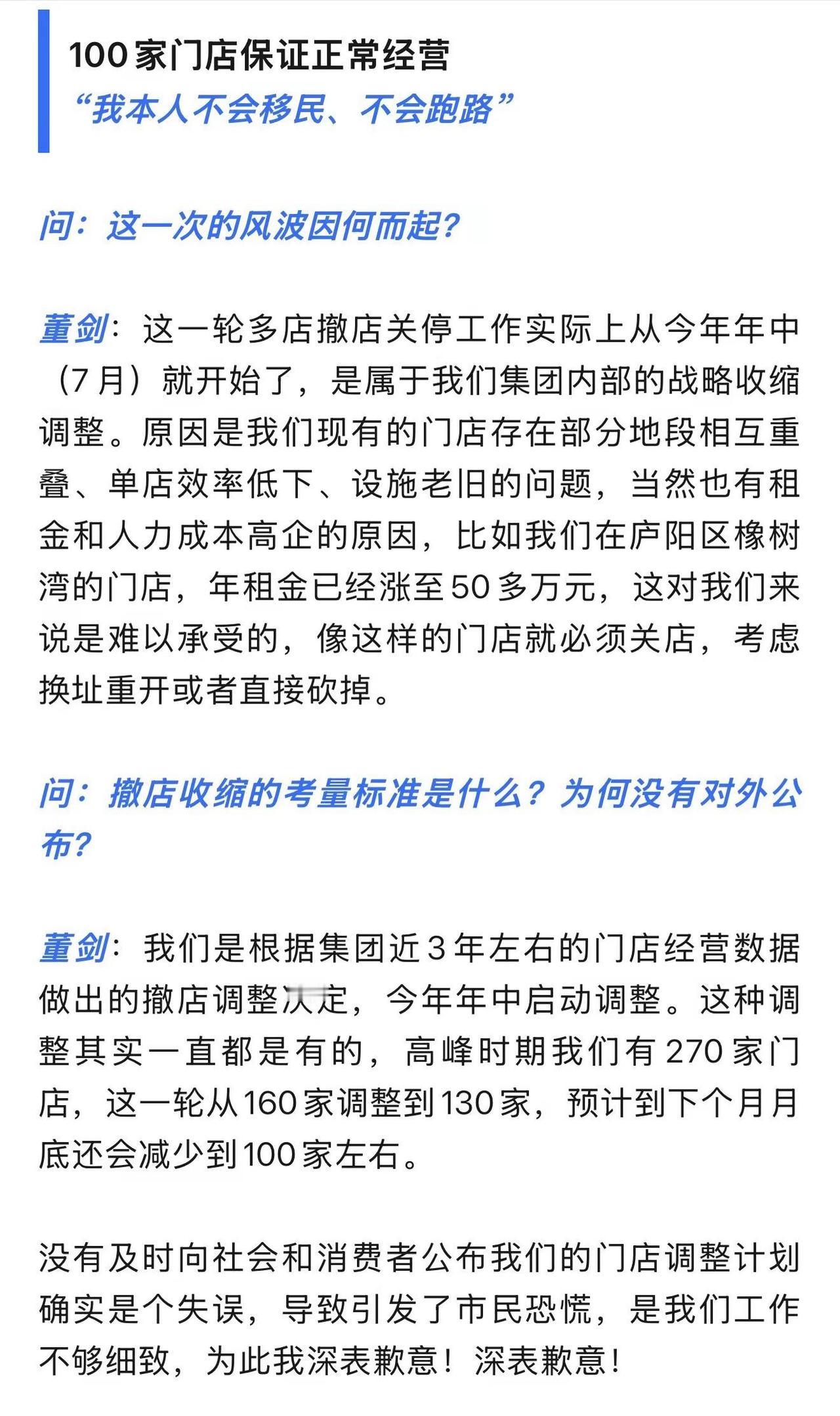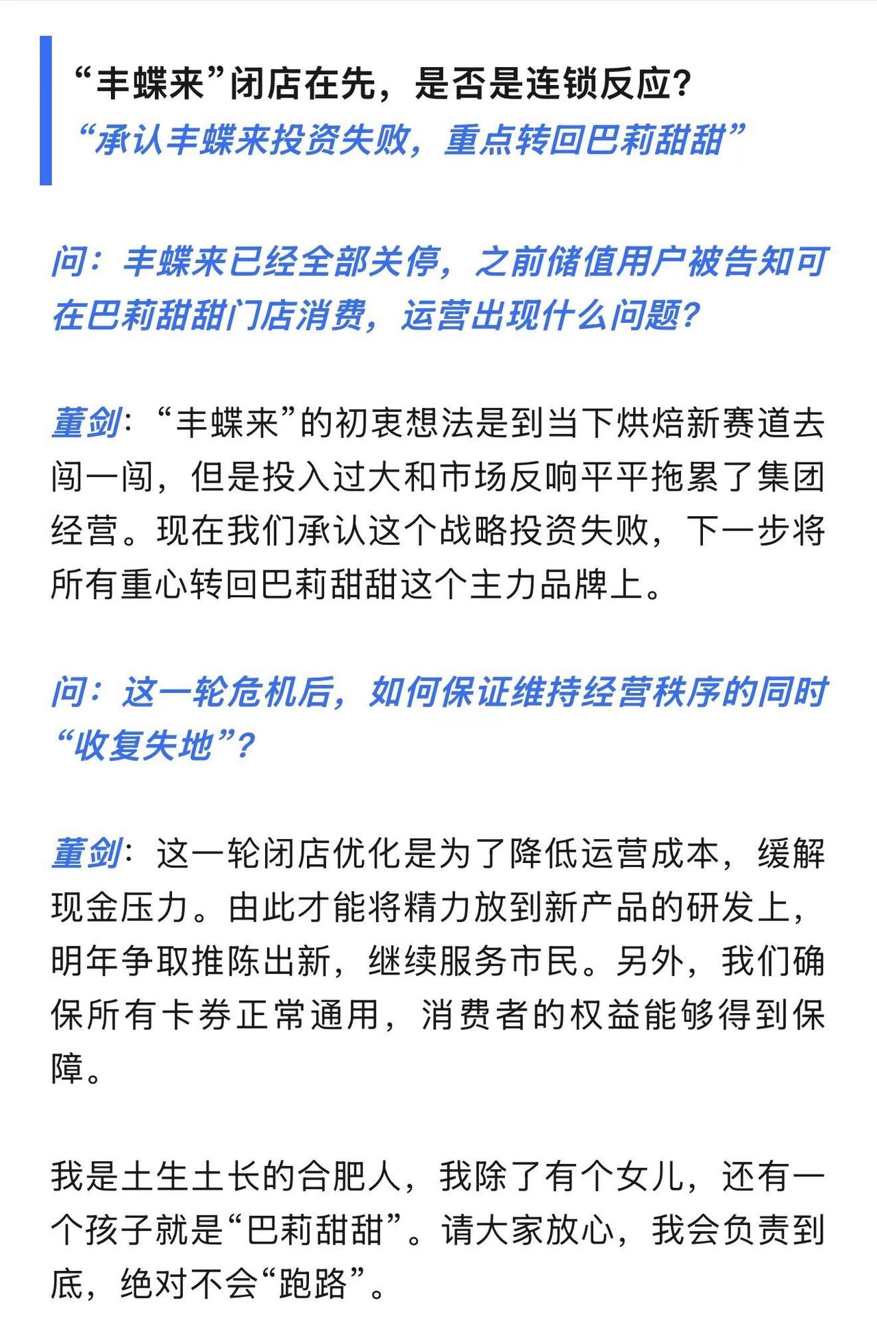 巴莉甜甜董事长首度现身回应闭店风波。媒体报道,巴莉甜甜董事长表示,决不跑路!负责到底!本土老品牌巴莉甜甜闭店风波后,董事长首度现身发声:撤店是因成本上涨导致的战略调整,供货量从未减少;同时坦诚“丰蝶来”投资失败,不回避问题。作为陪伴合肥人多年的老牌烘焙店,大家都不希望它倒下!欠薪等问题的解决,离不开企业的正常运转。呼吁网友理性吃瓜,给本土品牌一点重整的空间,期待巴莉甜甜能渡过难关,重拾往日烟火气~日常生活 今日热点 合肥 合肥美食