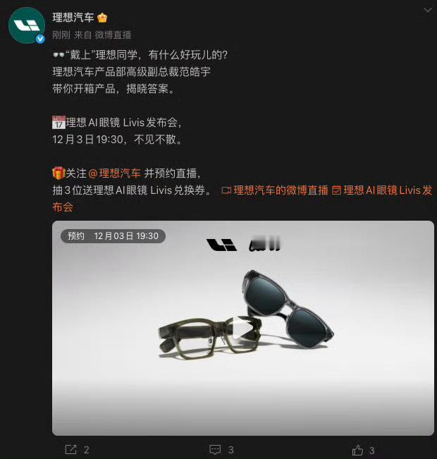 理想眼镜来了,据说有几个颜色,都不容易沾指纹,会不会有控车功能呢??哈哈哈